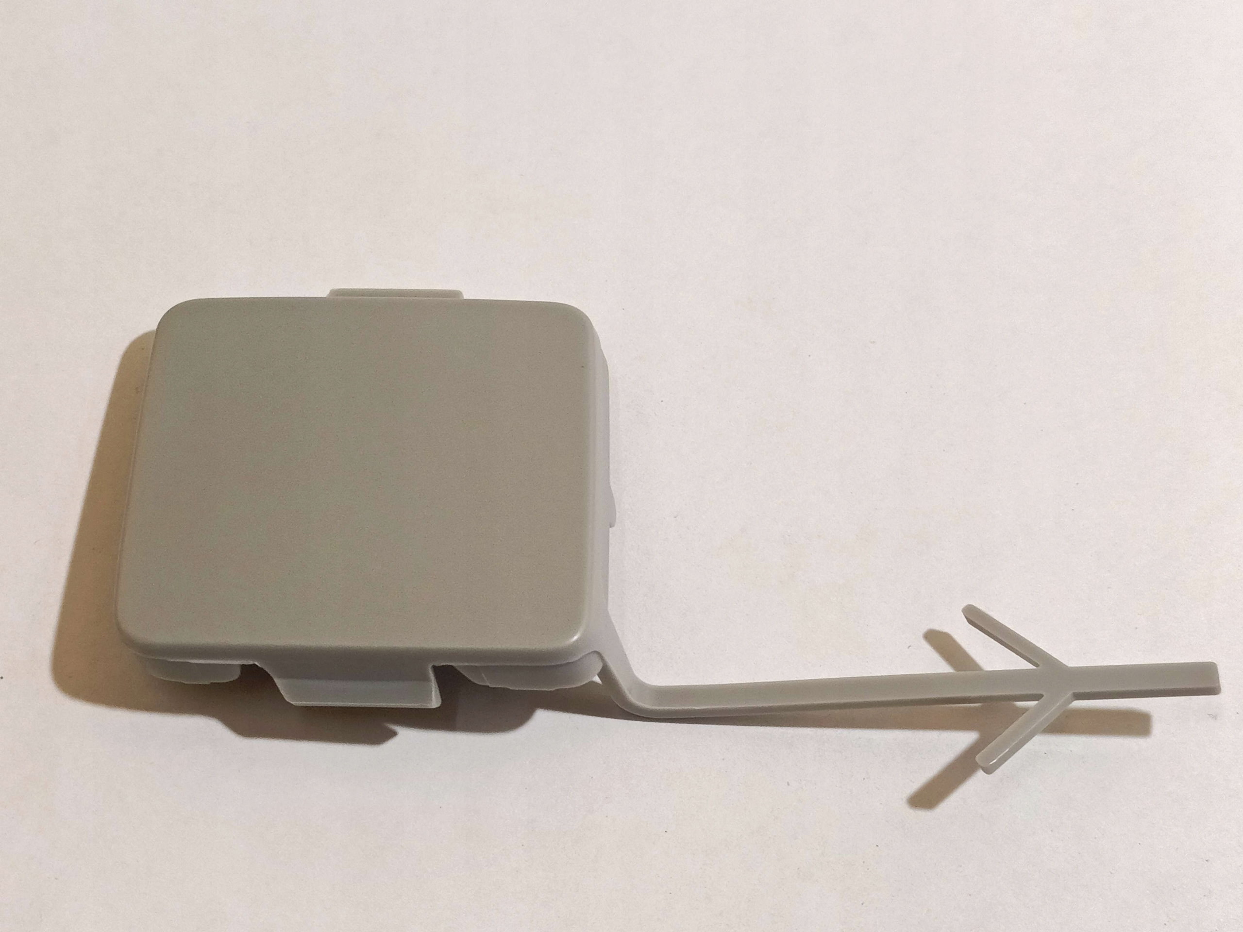 Oryginalna zaślepka otworu ucha holowniczego tylnego zderzaka, wykończenie GRU (grunt/primer) przygotowane pod lakierowanie, montowana centralnie na poszyciu tylnego zderzaka w miejscu mocowania haka/ucha holowniczego.