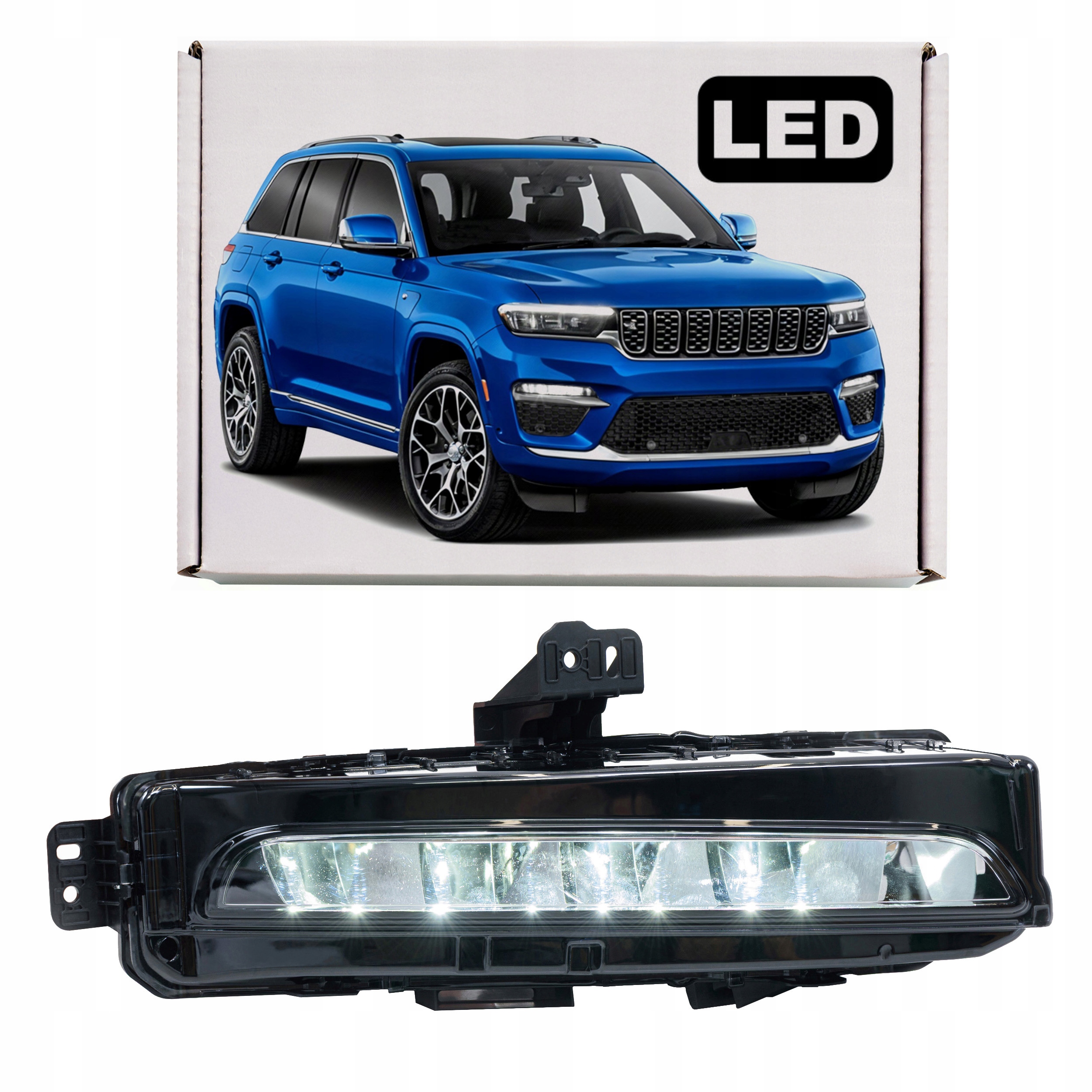 Lampa przeciwmgielna, halogen przedni DRL LED, prawy, dla JEEP GRAND CHEROKEE V (WL) 2021+. Lampa pasuje do wersji Limited i Summit Reserve w wersji krótkiej (krótkie nadwozie), nie pasuje do wersji Limited Long (długie nadwozie).