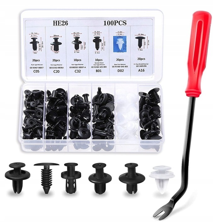 ⭐ Zestaw 100 uniwersalnych kołków, spinek i zatrzasków samochodowych w różnych rozmiarach i kształtach umożliwi mocowanie elementów