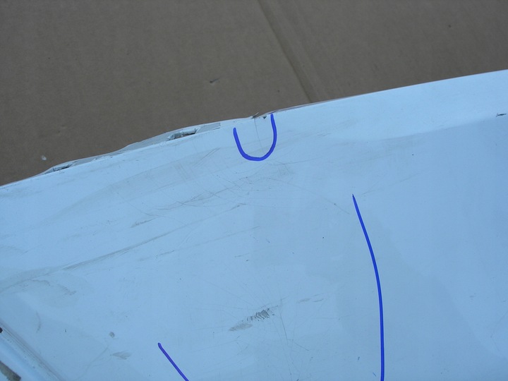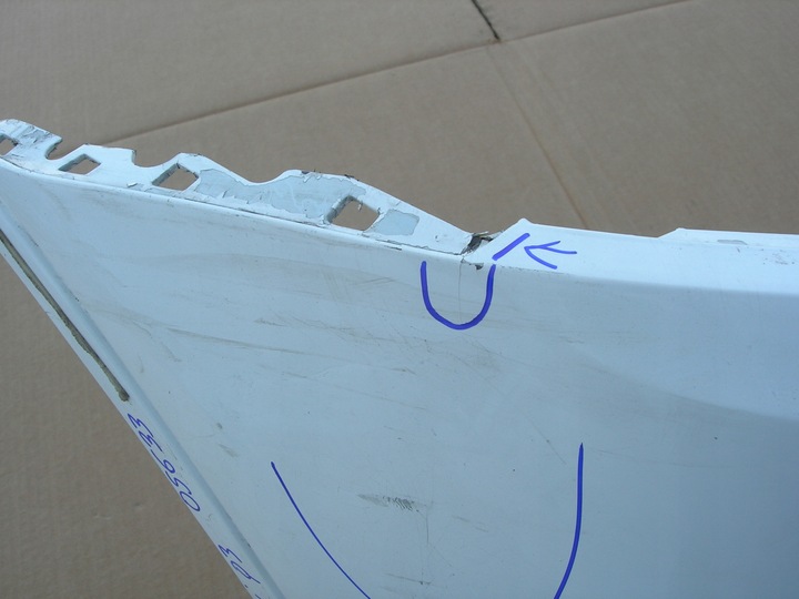 ĆWIARTKA PRAWA ZDERZAKA PRZEDNIEGO, STAN JAK NA ZDJĘCIACH ( pęknięcia, zarysowania, odkształcenia zaznaczone markerem) , ORYGINALNA DO