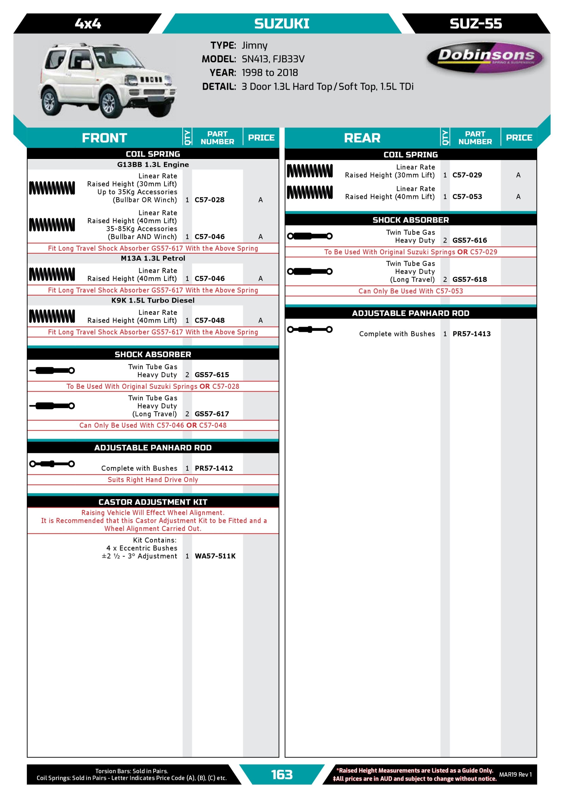 Dobinsons Spring and Suspension™ w fabryce zlokalizowanej w środkowej części stanu Queensland w Australii z dumą produkuje najwyższej jakości sprężyny śrubowe oraz resory piórowe dla wielu różnych aplikacji zgodnie z międzynarodowym standardem jakości ISO9001:2008 .Dobinsons™ może poszczycić się jedną z największych na świecie gamą produktów do której zaliczają się sprężyny podnoszące dla segmentu 4x4 oraz sprężyny do pojazdów specjalnych. W związku z tym, że niejednokrotnie potrzebne jest zastosowanie wielu rodzajów sprężyn dla jednego modelu samochodu, Dobinsons™ jako producent posiadający fabrykę w tej samej lokalizacji co biuro główne może wyprodukować sprężyny w malej ilości wg specyfikacji klienta. To daje gwarancję otrzymania odpowiedniego produktu dopasowanego precyzyjnie do aplikacji i jednocześnie uniknięcia sytuacji typu “One Size Fits All” W połączeniu z amortyzatorami Dobinsons™ gazowo-olejowymi zapewnia to niezrównane osiągi i jakość prowadzenia.