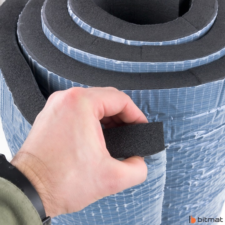 Pianka izolacyjna gumowa o strukturze komórek zamkniętych z warstwą mocnego kleju, posiada wysokie właściwości akustyczne oraz izolacyjne.