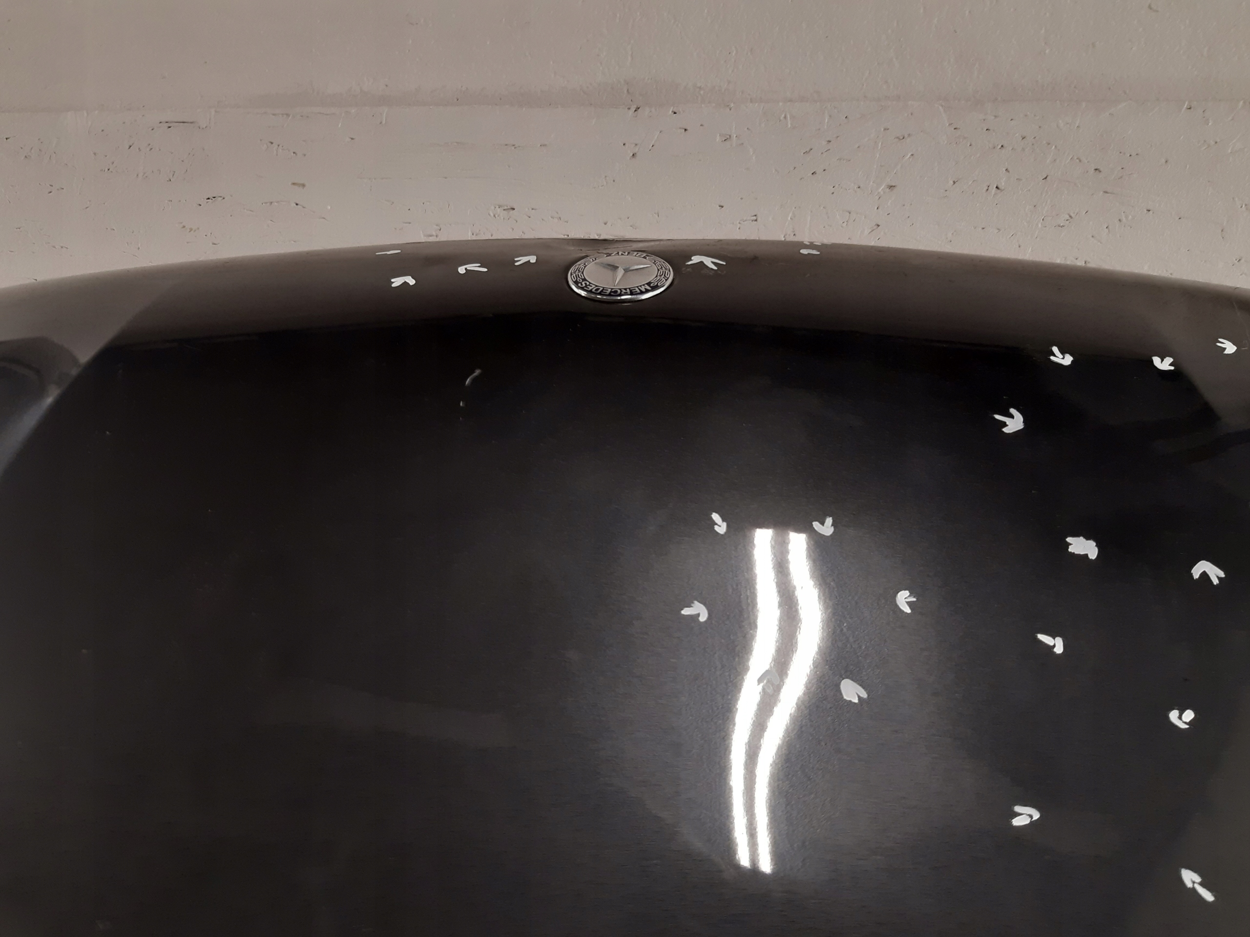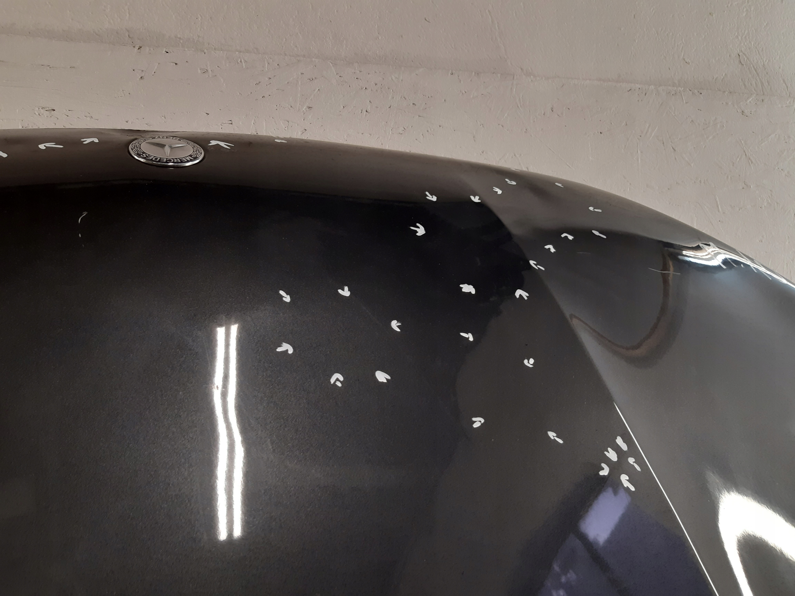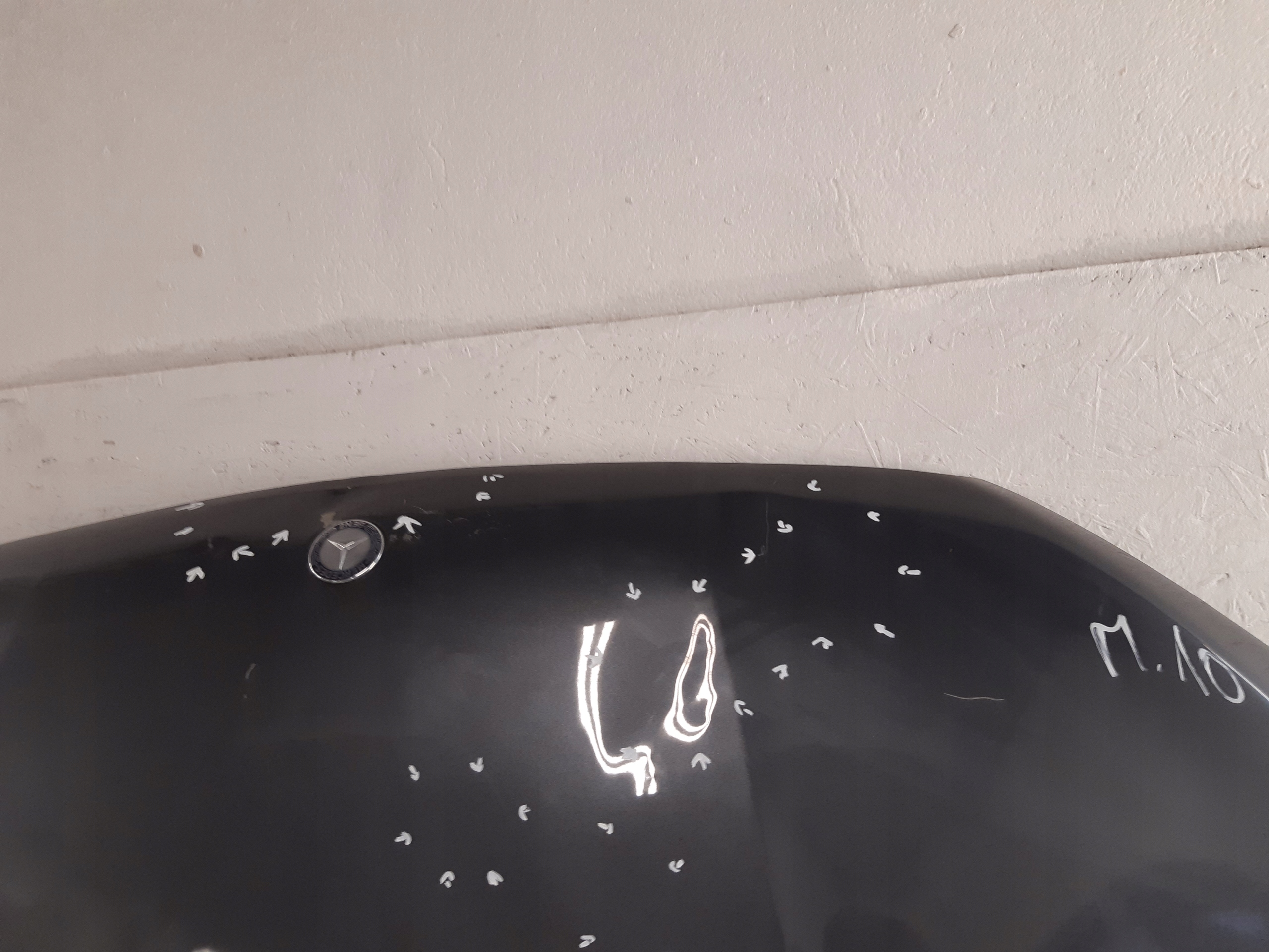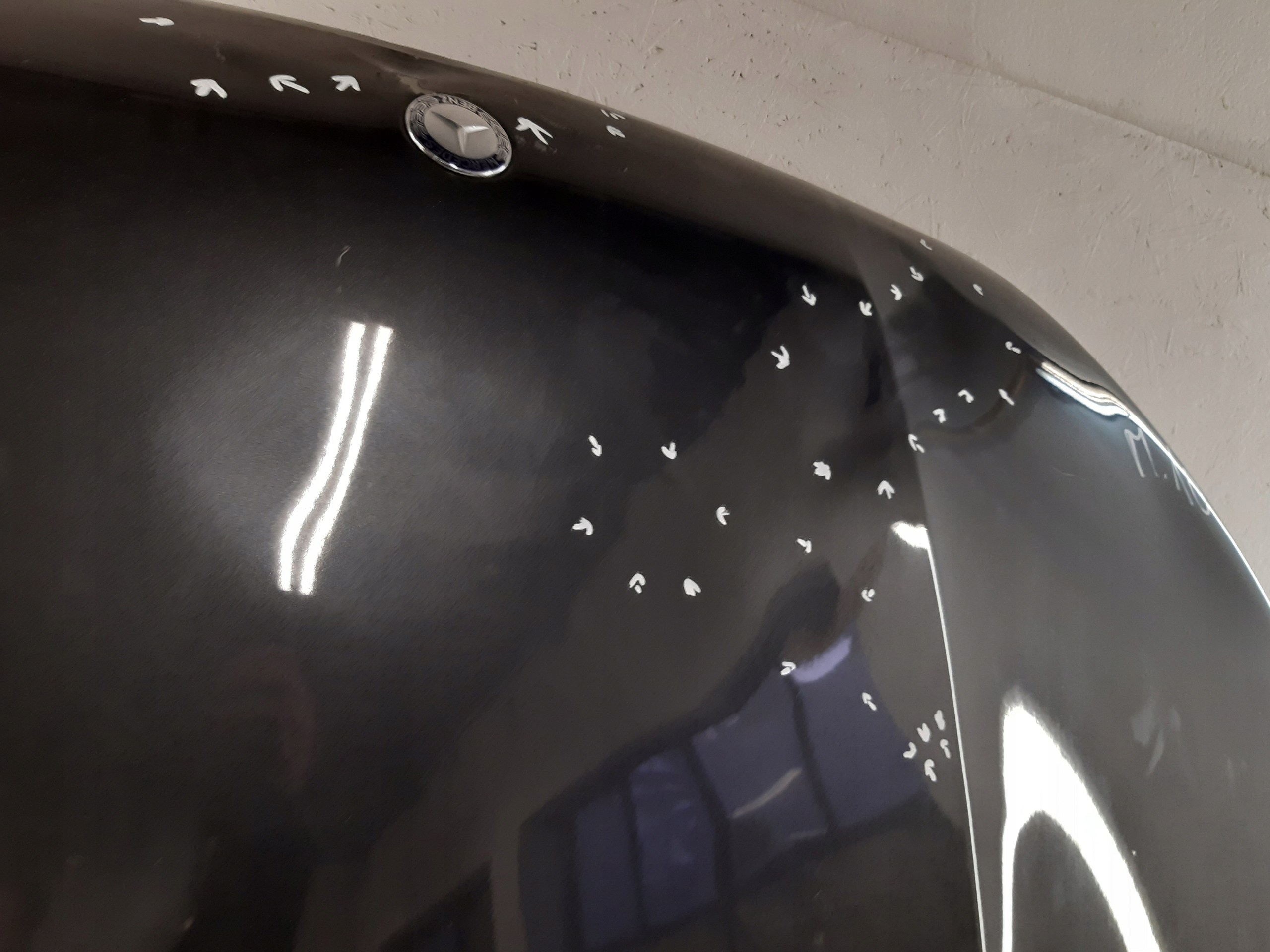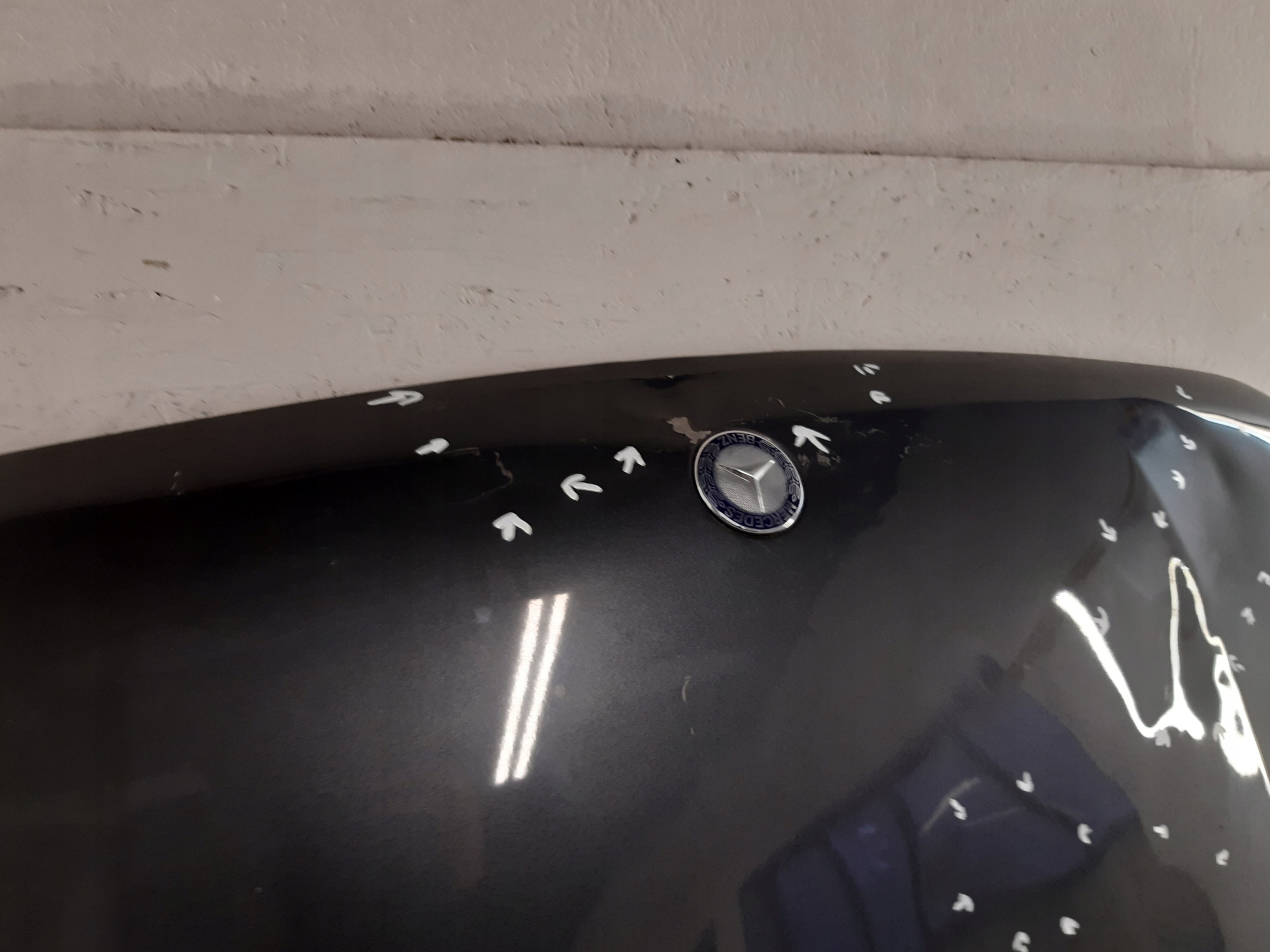 MERCEDES X-KLASA W470 MASKA PRZEDNIA POKRYWA uszkodzenia zaznaczone marker do naprawy blacharsko lakierniczej