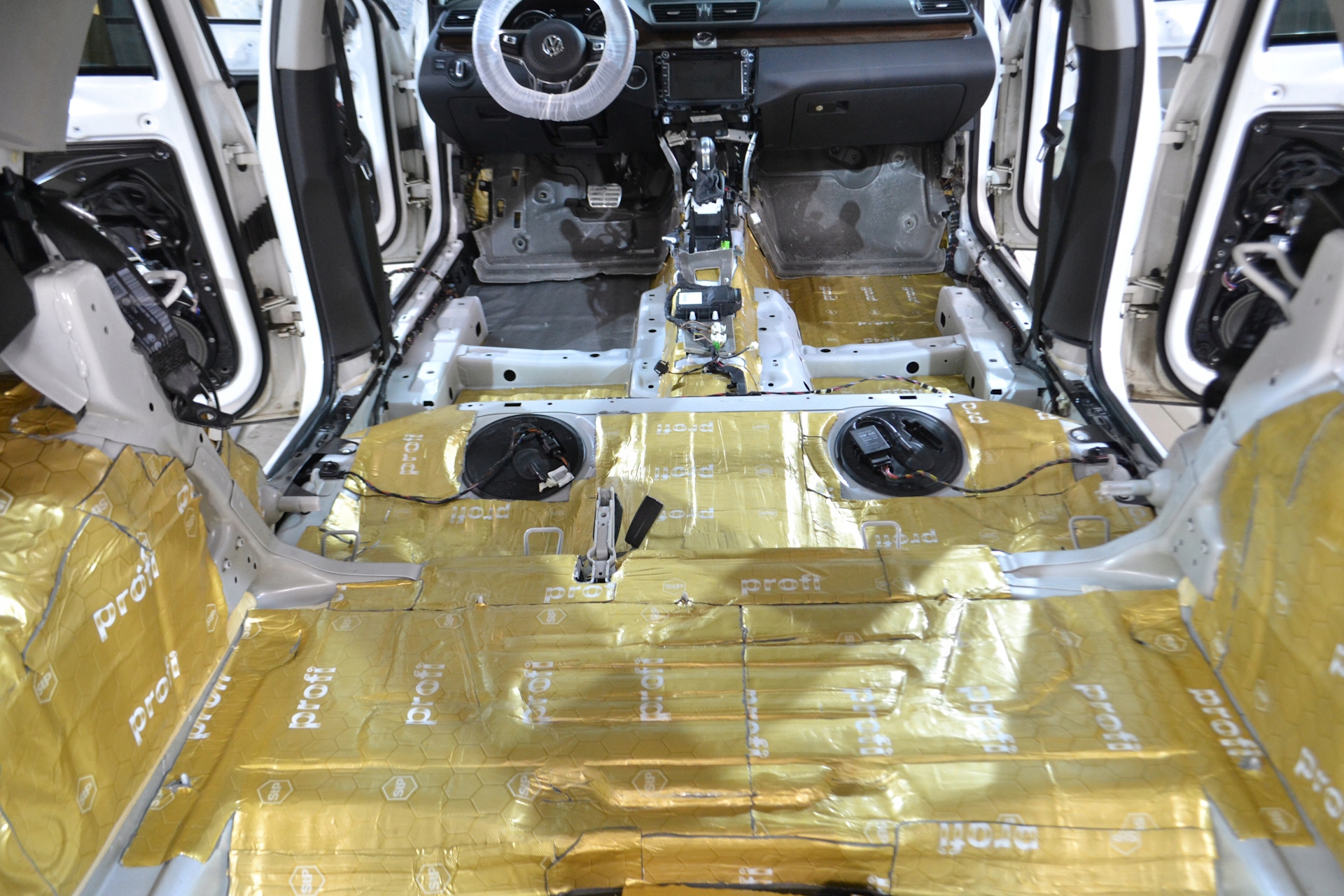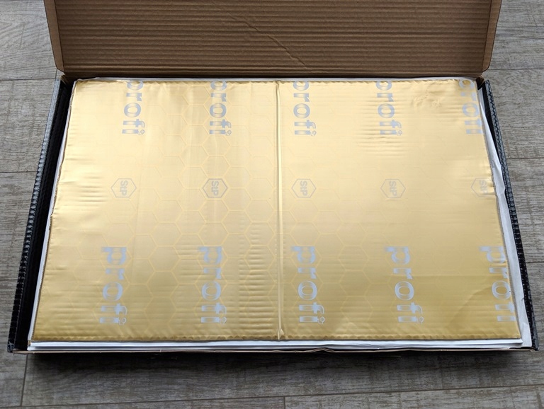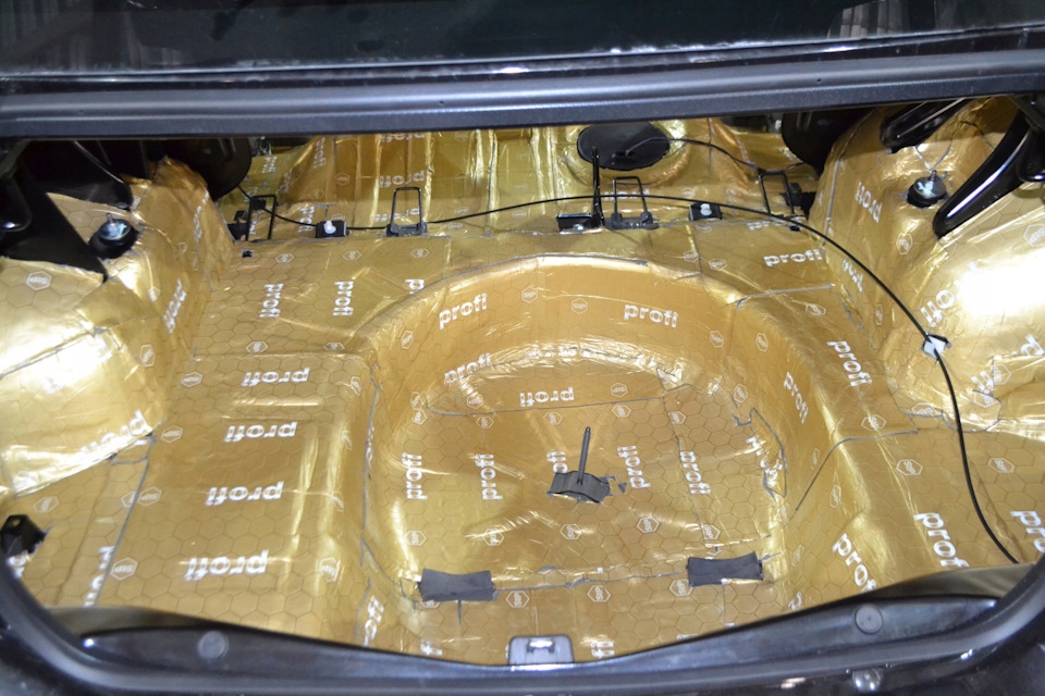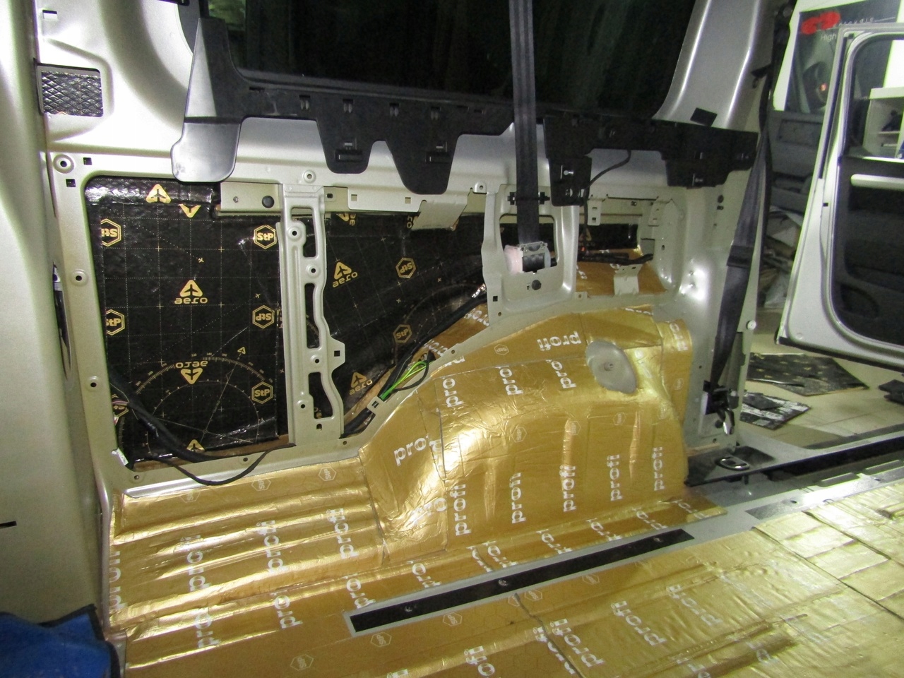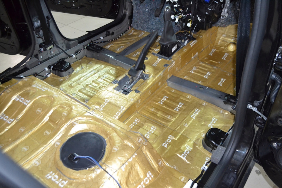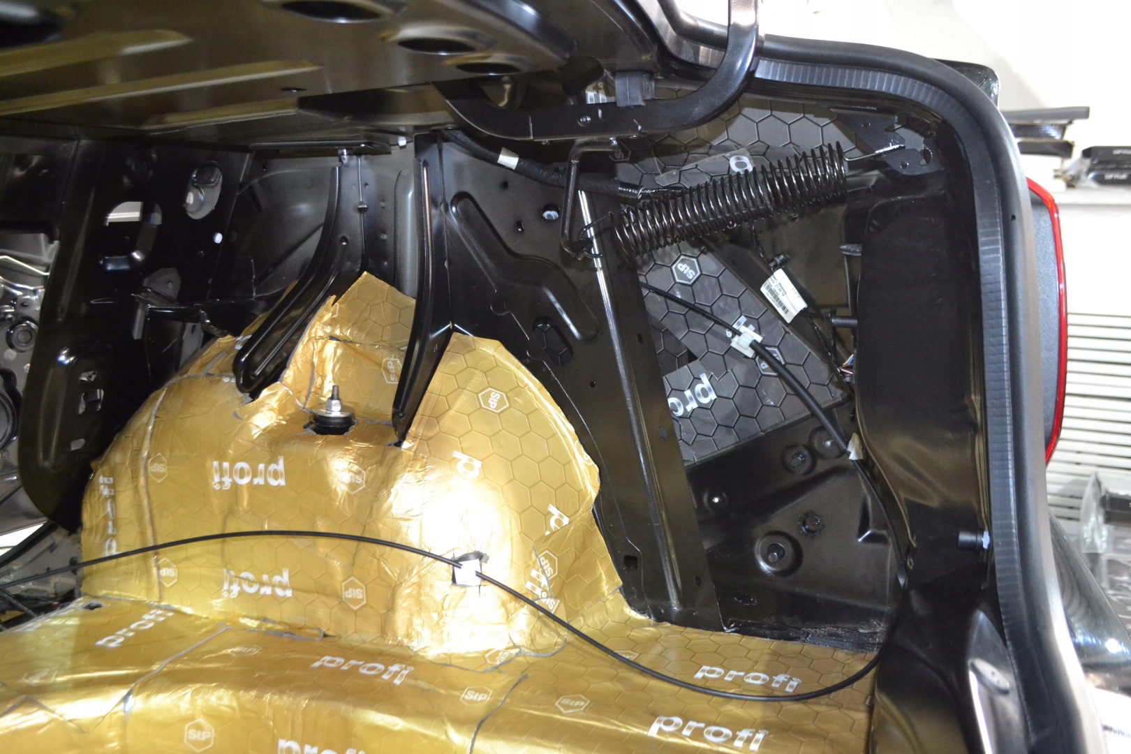 - Maty butylowe naklejamy na niedużą zakładkę. Omijamy miejsca montażowe na śruby, a wiązki elektryczne wyciągamy na zewnątrz.