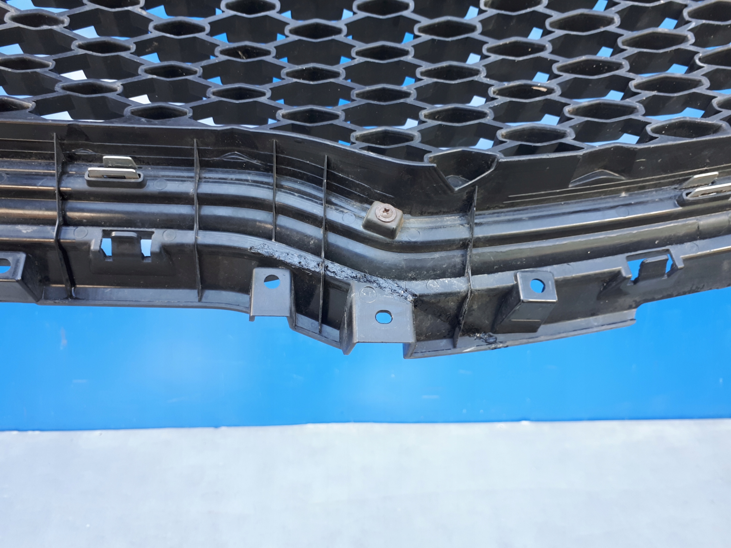 - ATRAPA MA USZKODZONE DW GÓRNE MOCOWANIA, W DOLNEJ CZĘŚCI SPAWANE PĘKNIECIE, ZAZNACZONE NA ZDJĘCIACH. USZKODZENIE NIE JEST WIDOCZNE PO ZAMONTOWANIU W ZDERZAK. CHROM BEZ USZKODZEŃ.