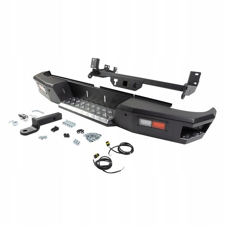 Mocny, stalowy zderzak tylny OFD posiada podświetlane z dwóch stron miejsce na tablicę oraz wbudowane kierunkowskazy i światła cofania. Produkt wyposażony został również w miejsce na dwa czujniki parkowania. Duży stopień na środku zderzaka oraz dwa boczne wyłożono aluminiową blachą ryflowaną. Materiał ten nie rdzewieje i nadaje dodatkowej przyczepności.