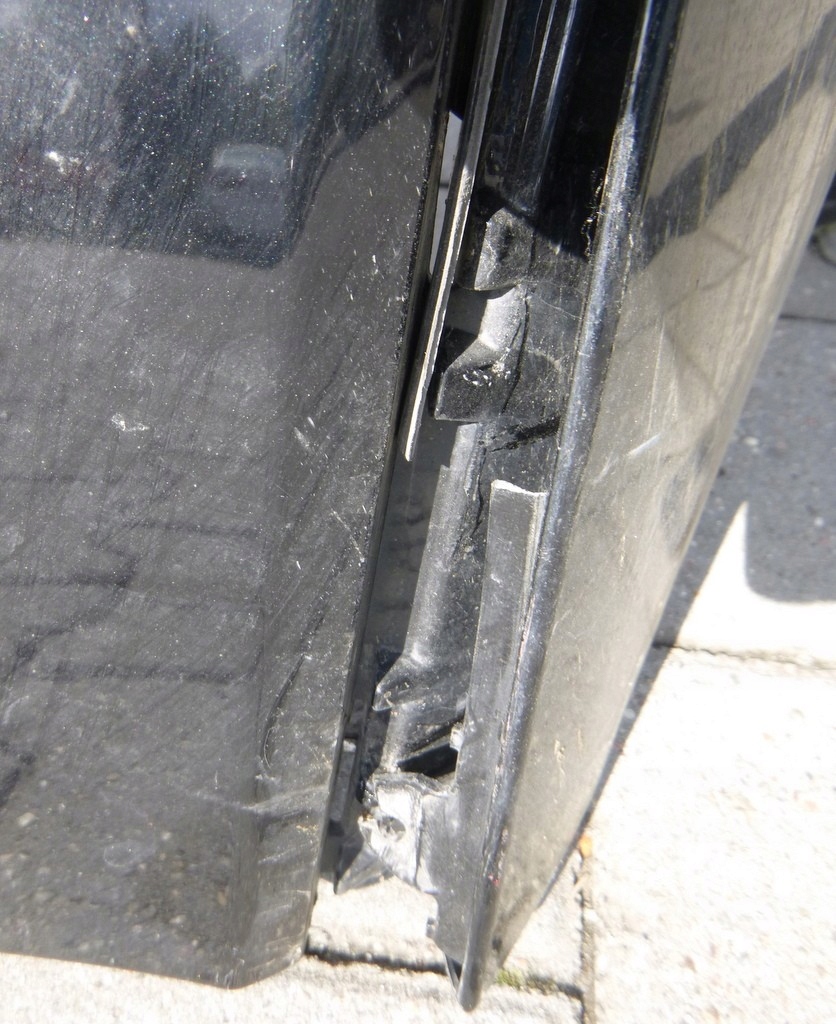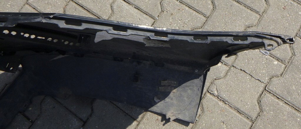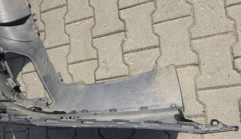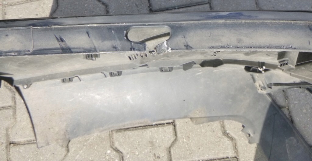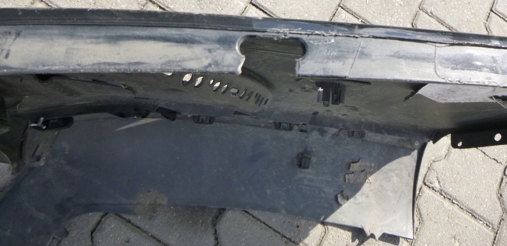 Zderzak ma wyrwane mocowanie dokładki z lewej strony, wyłamane mocowania górne.