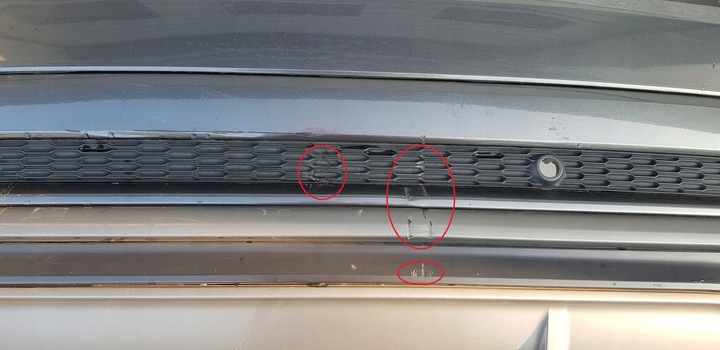 - POSIADA RYSY I DROBNE PRZETARCIA ORAZ WYSZCZERBIENIE NA KRATCE I DOKŁADCE ZDERZAKA -ZAZNACZONE NA ZDJ.