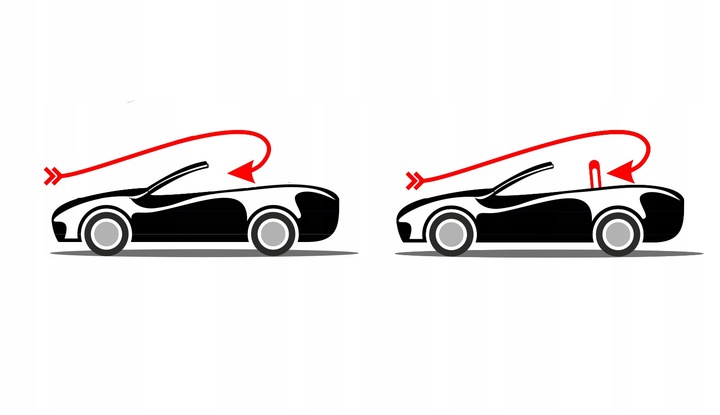 Windschott zainstalowany w kabriolecie chroni pasażerów przed zawirowaniami powietrza wewnątrz samochodu, dzięki czemu powstaje strefa ciszy. Widać wyraźnie różnicę w przepływie powietrza na grafice obok.