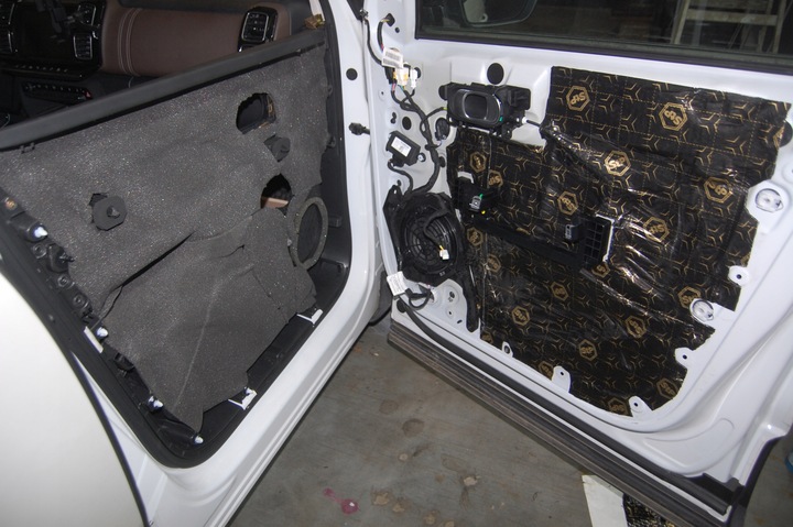 - Maty butylowe naklejamy na niedużą zakładkę. Omijamy miejsca montażowe na śruby, a wiązki elektryczne wyciągamy na zewnątrz.