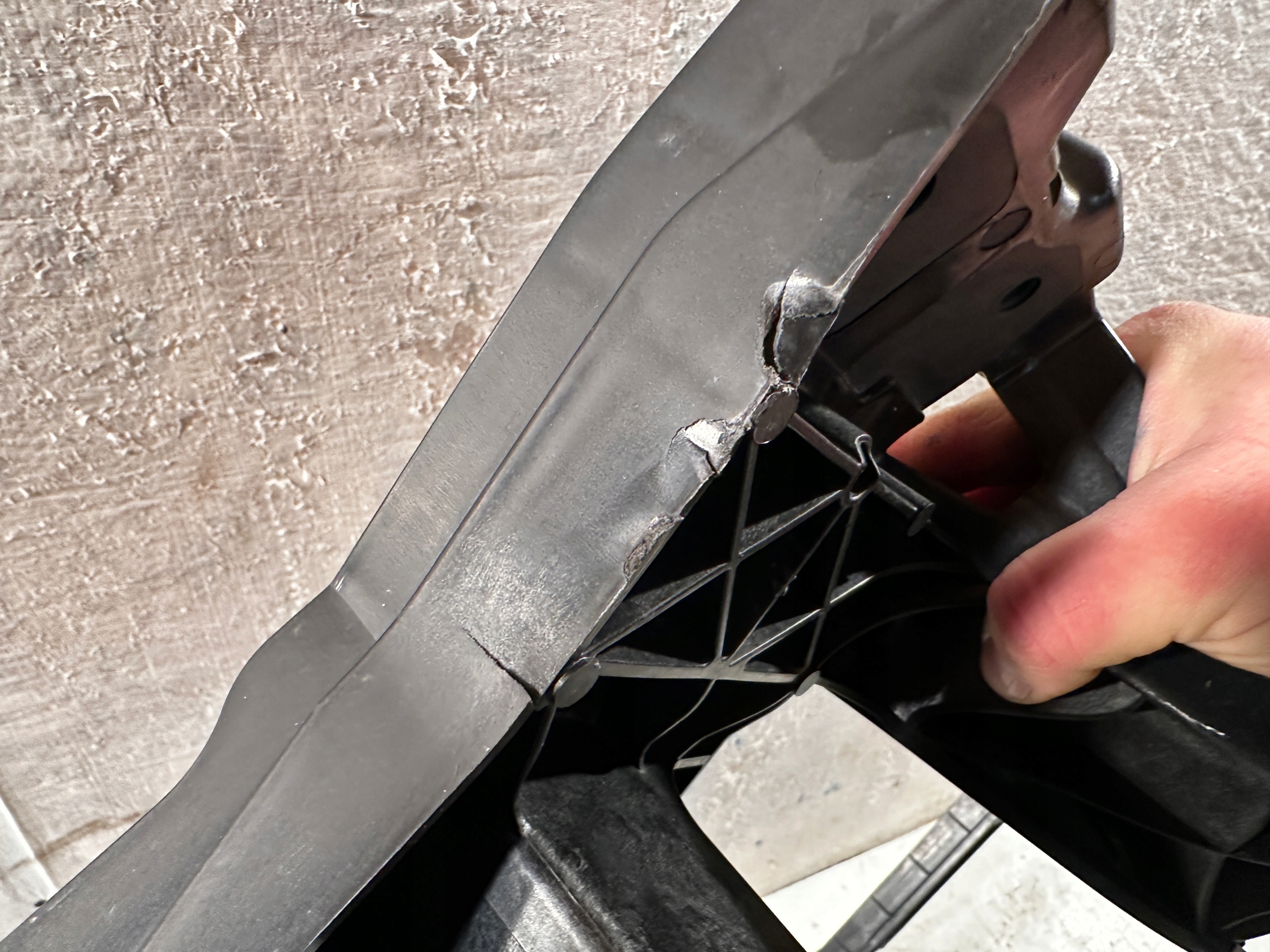 Wzmocnienie lekko uszkodzone w miejscach widocznych na zdjęciach. Belki ok. Cena za całość widoczną na zdjęciach. Jeden plastik przykręcany do belki uszkodzony jak na foto.