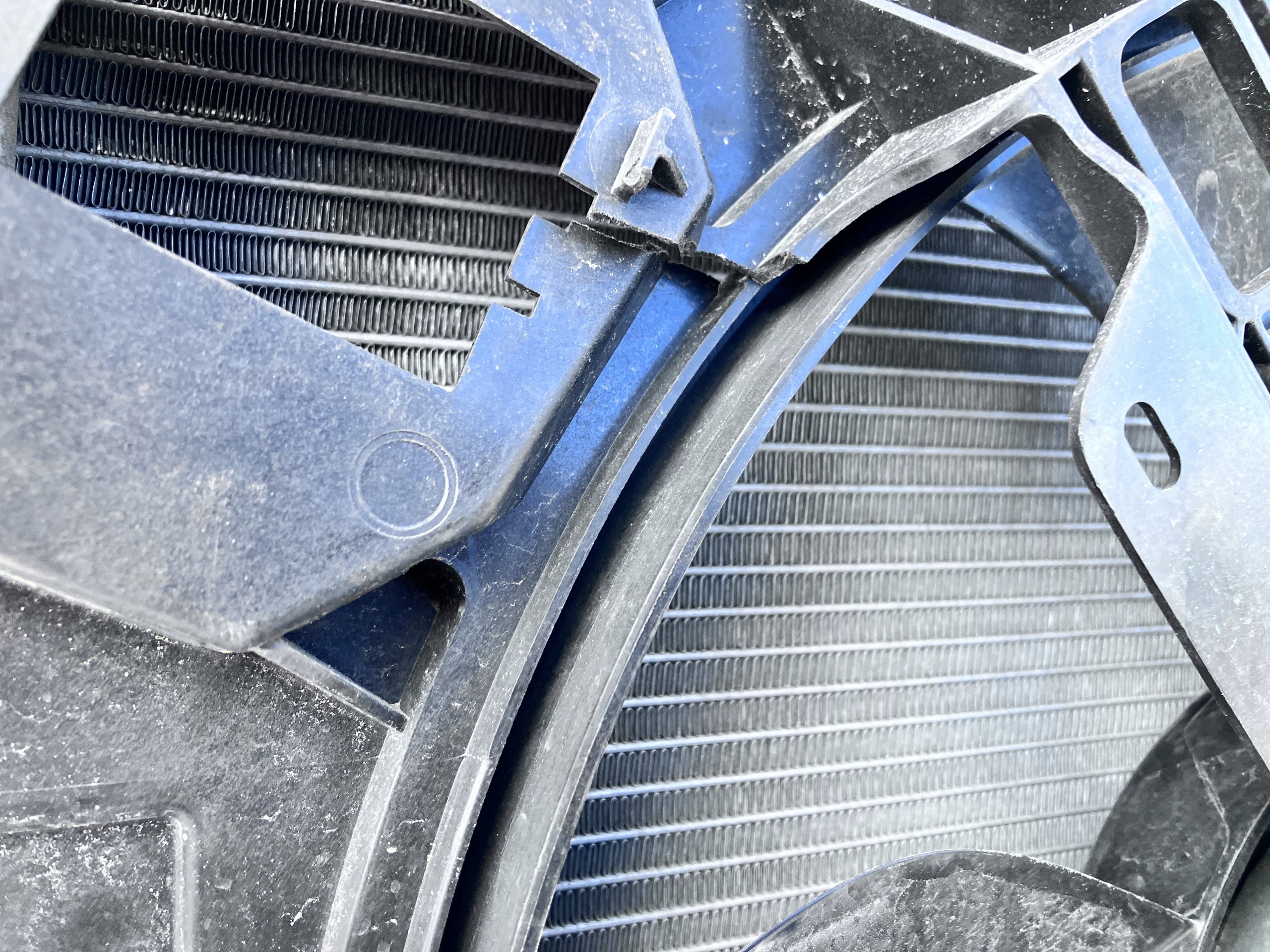 KOMPLET CHŁODNIC Z WENTYLATOREM I KIEROWNICĄ POWIETRZA JAK NA ZDJĘCIACH, USZKODZONE DOLNE LEWE MOCOWANIE