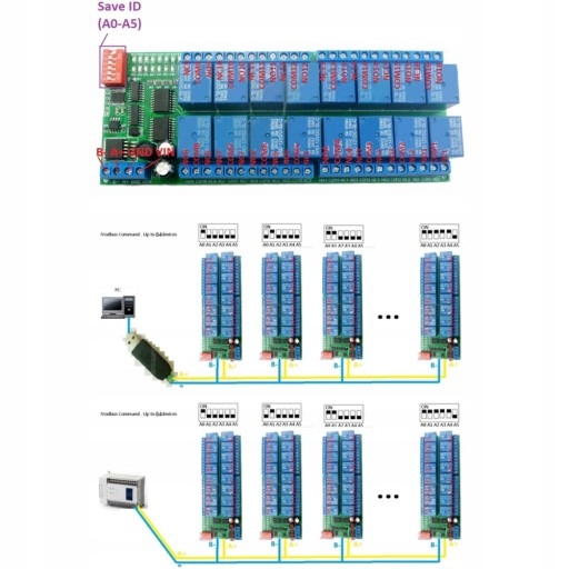 Specyfikacja: Cechy: 1. Napięcie robocze wynosi 12 V prądu stałego. 2. Prąd czuwania (wszystkie przekaźniki zamknięte) wynosi 11MA, 1 przekaźnik otwarty 40MA, 2 przekaźniki otwarte 67MA, 3 przekaźniki otwarte 95MA, 4 przekaźniki otwarte 121MA, 5 przekaźników otwartych 147MA, 6 przekaźników otwartych 173MA, 7 przekaźników otwartych 198MA, 8 przekaźników otwartych 222MA ... 3. 6 poleceń: „Otwórz”, „zamknij”, „Chwilowy”, „Samoblokujący”, „Blokada” i „Opóźnienie”. 4. Tryb sterowania poleceniami MODBUS RTU, maksymalne opóźnienie wynosi 255 sekund. 5. Polecenia MODBUS można wprowadzać szeregowo HyperTerminal (asystent szeregowy) lub wprowadzać „Modbus Poll”. 6. W trybie poleceń MODBUS ten moduł przekaźnikowy może obsługiwać równolegle do 64 urządzeń. Specyfikacja: Napięcie robocze: prąd stały 12 V Prąd czuwania: 11MA Maksymalne obciążenie: 10A/250VAC, 10A/125VAC, 10A/30VDC, 10A/28VDC, 10A/12VDC Rozmiar: ok. 17*6,5*2cm / 6,7*2,5*0,8 cala Waga: ok. 224 g/7,9 uncji Typowe aplikacje: Tryb poleceń MODBUS (HEX), możesz kontrolować na różne sposoby: Serial Hyper Terminal Control (trzeba ręcznie dodać CRC), sterowanie oprogramowaniem Modbus Poll (oprogramowanie automatycznie dodaje CRC), sterowanie procesem PLC lub MCU. Schemat połączeń: 1. Obwód sterowania DC12V, schemat połączeń poniżej. "LOAD" może być kamerą, diodami LED, wentylatorami, silnikami i innym sprzętem DC 12V. 2. Obwód sterowania DC 1-100 V lub AC 85-265 V, schemat połączeń poniżej (uwaga: jeśli nie ma obciążenia DC 12 V, potrzebny jest inny zasilacz DC 12 V). „OBCIĄŻENIE” może być oświetleniem LED, wentylatorami, oświetleniem silników, lampami fluorescencyjnymi, słonecznymi podgrzewaczami wody i innymi urządzeniami prądu stałego. Lista pakietów: 1*16 kanałowy przekaźnik RS485