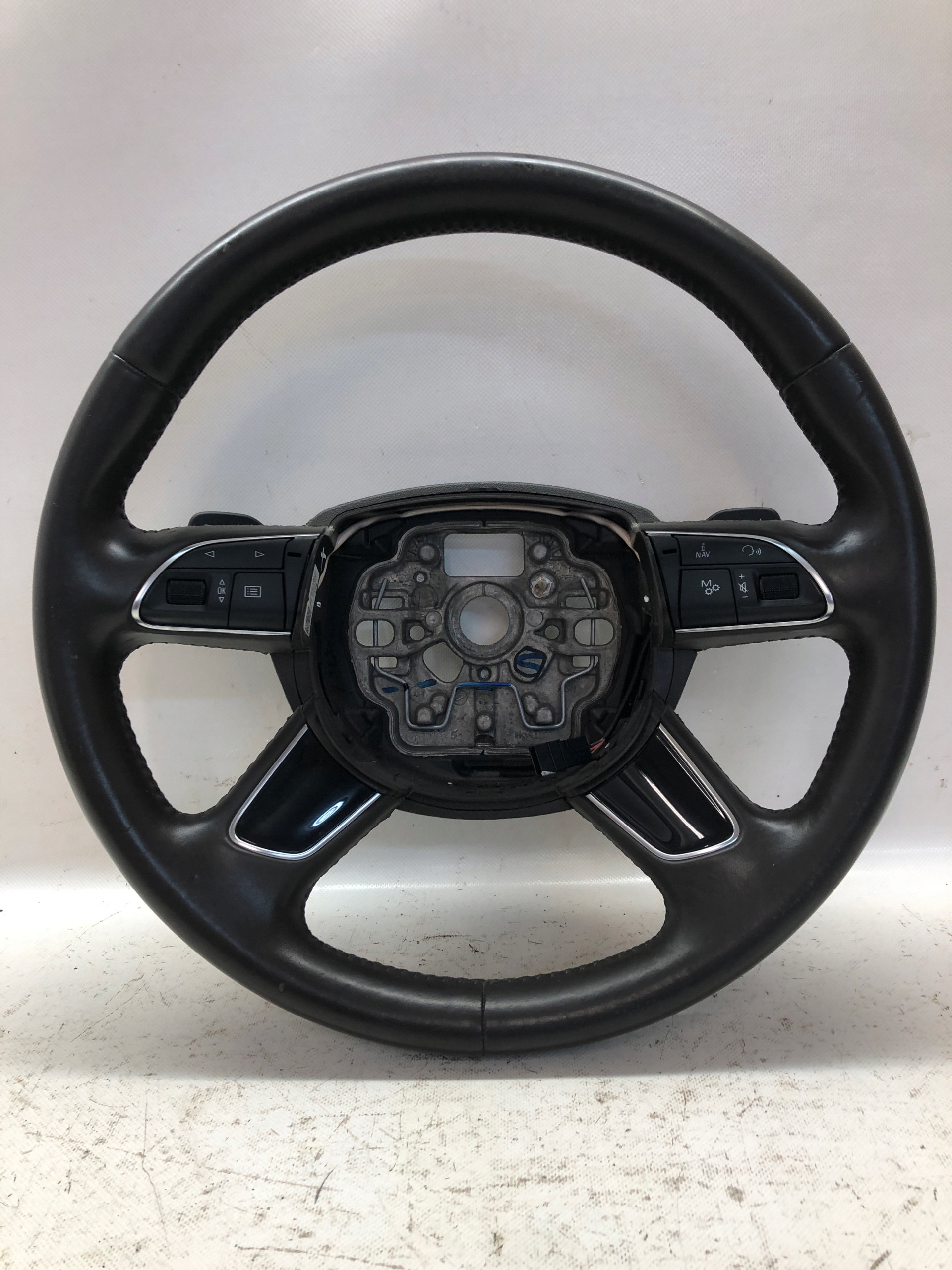 Przedmiotem aukcji jest SKÓRZANA (ODCIEŃ SKÓRY- CIEMNY BRĄZ) 4-RAMIENNA MULTIFUNKCYJNA KIEROWNICA Z ŁOPATKAMI DO AUDI A8 D4