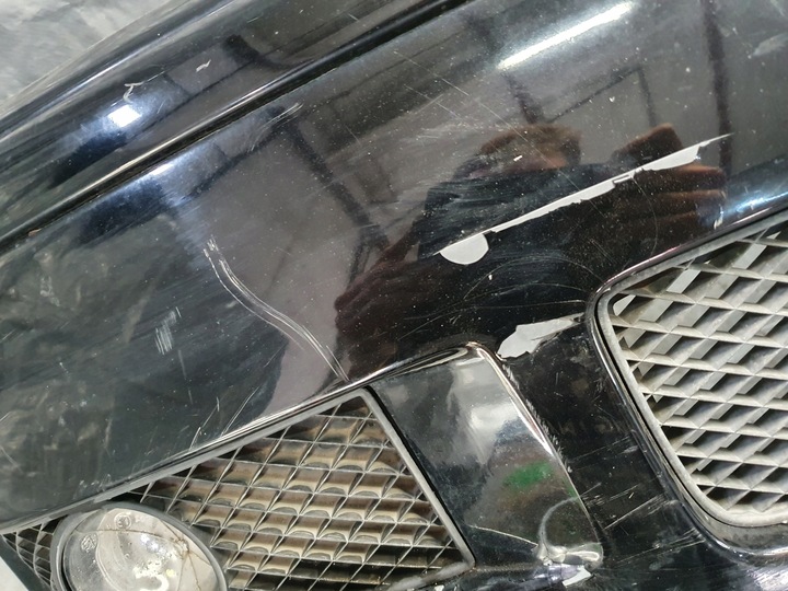 Zderzak posiada wady takie jak: rysy, odpryski, odchodzący i popękany lakier, otwory po wkrętach mocujących tablicę rejestracyjną, pęknięty halogen co widać na załączonych zdjęciach.