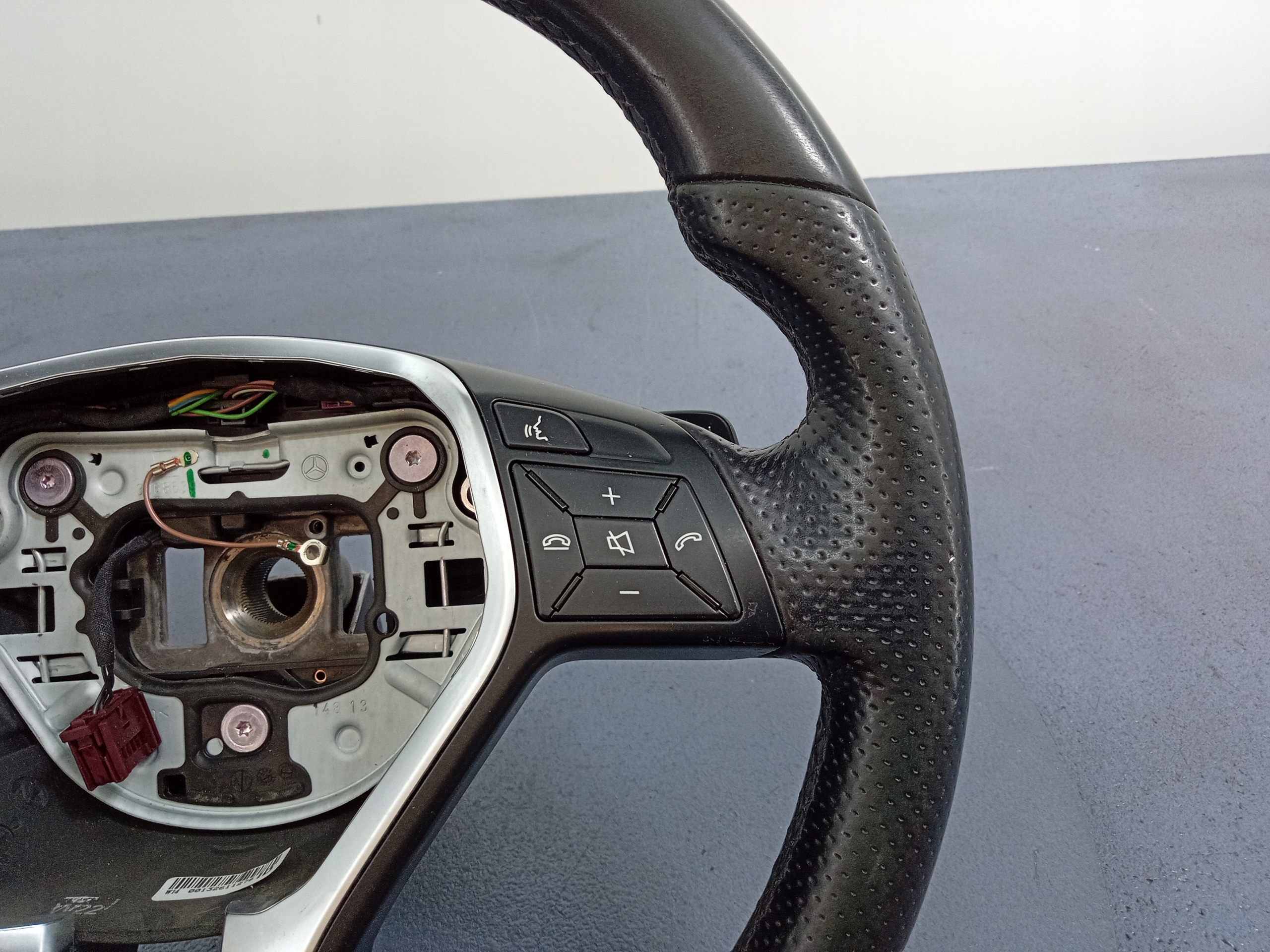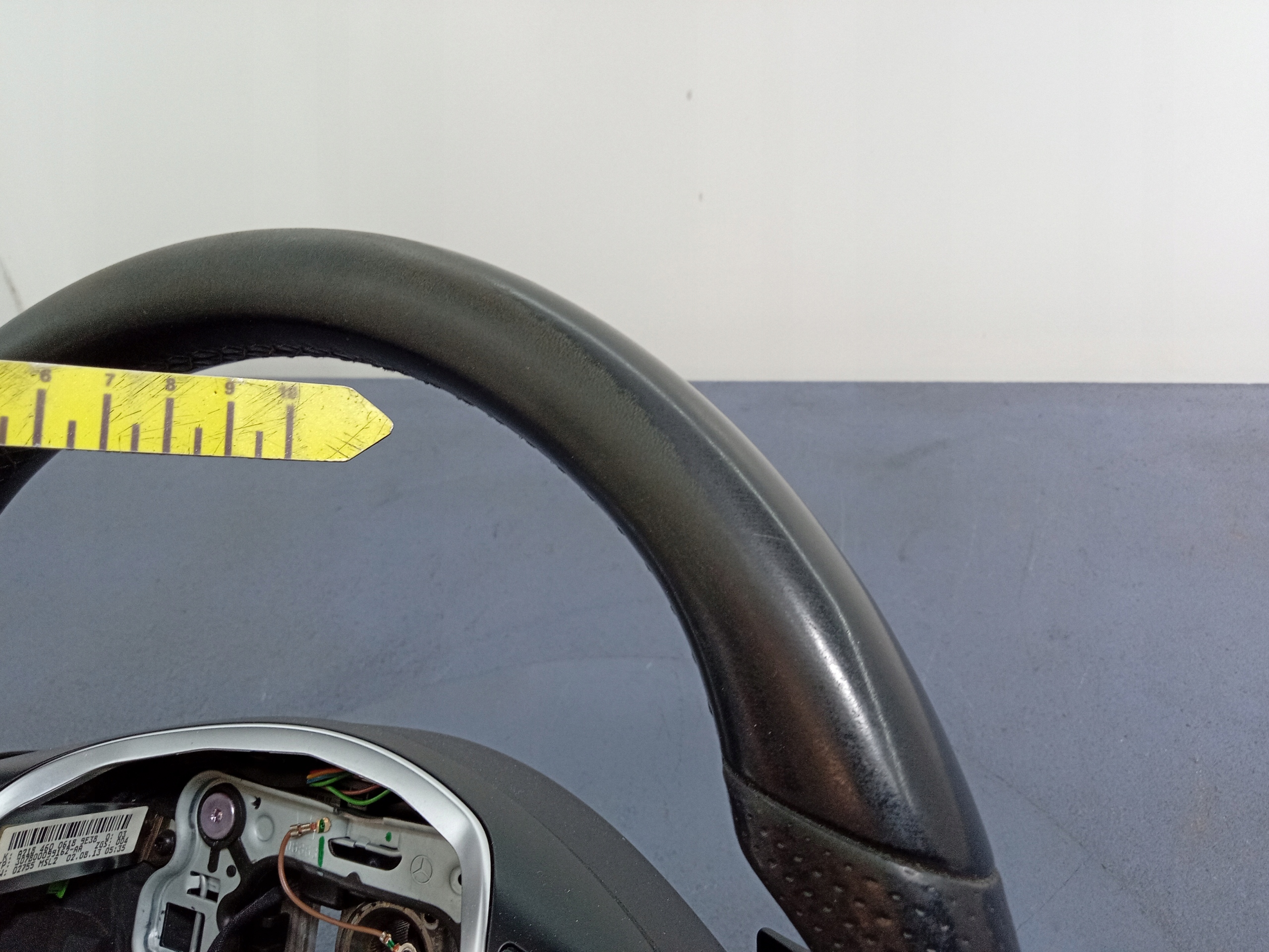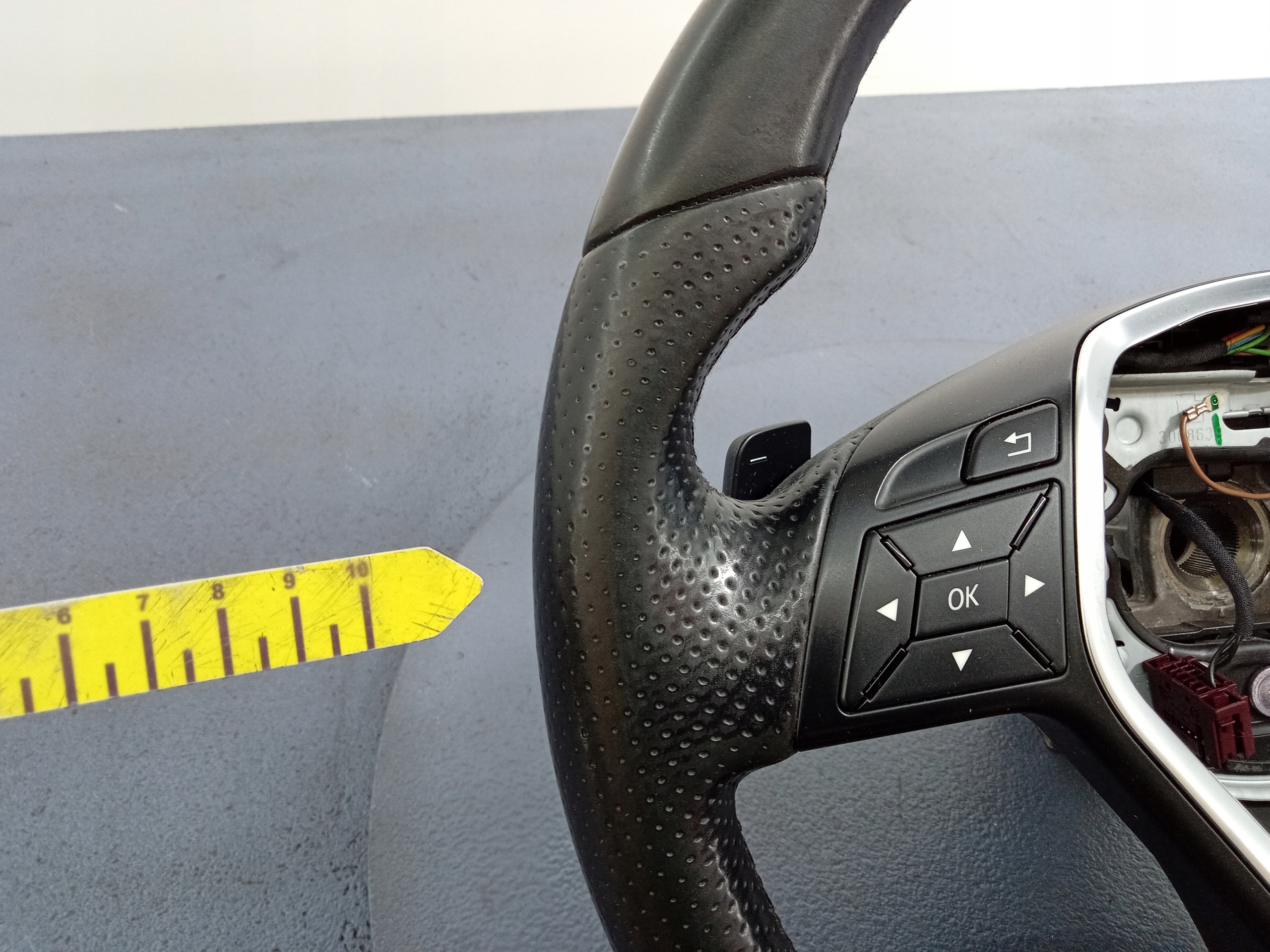 Opis: kierownica trójramienna, skórzana, z multifunkcją, łopatkami skrzyni automatycznej, widoczne ślady użytkowania, -jakość B && E KLASA W212 LIFT KIEROWNICA SKÓRA ŁOPATKI