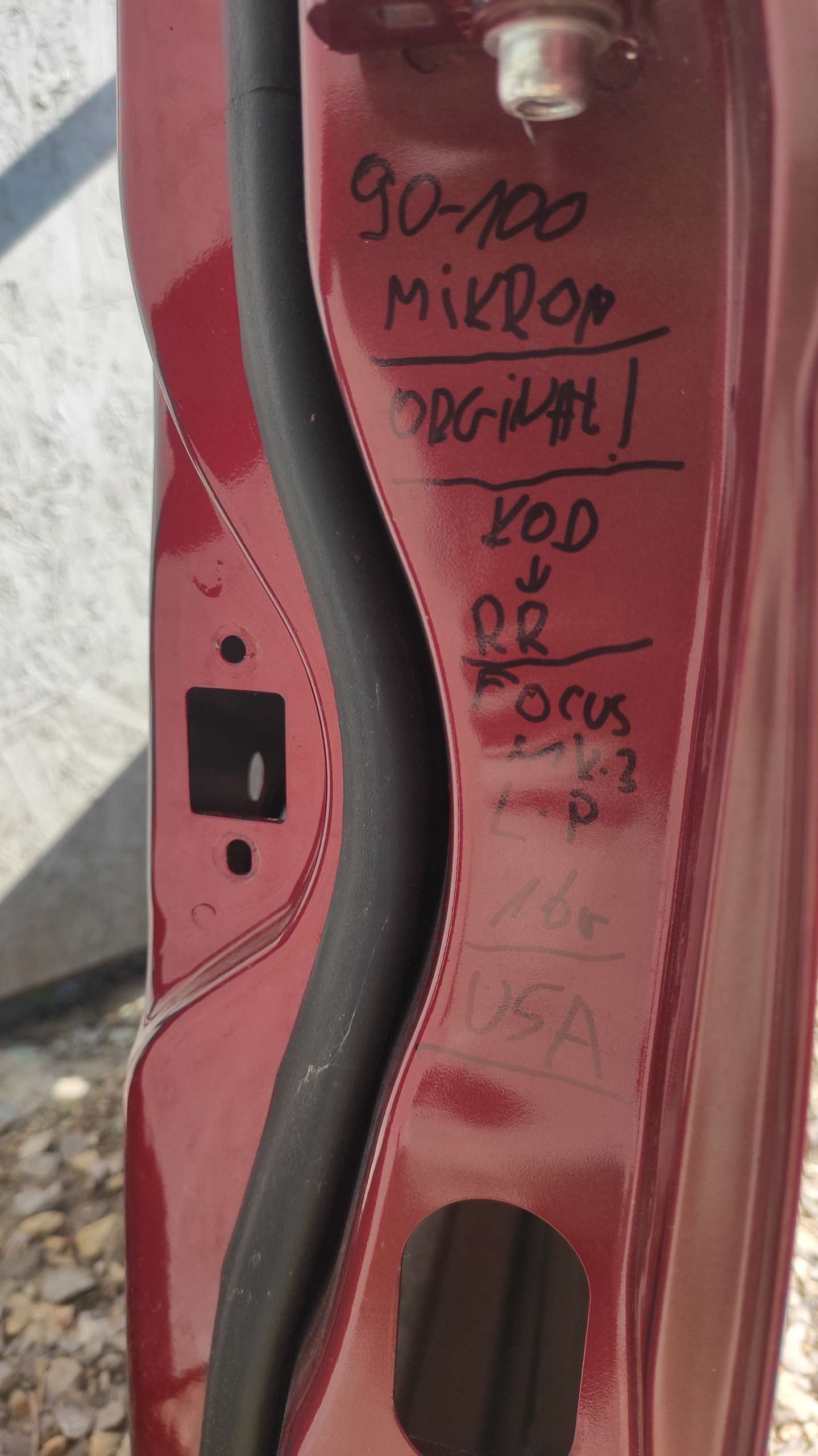 DRZWI POCHODZĄ ZE STANÓW ZJEDNOCZONYCH - KOD LAKIERU DRZWI JEST KODEM DOSTOSOWANYM POD CZĘŚCI BLACHARSKIE STRICHTE SPROWADZANE ZE STANÓW ZJEDNOCZONYCH WIĘC JEŚLI KTOŚ SZUKA DRZWI DO FORDA FOCUS ZAKUPIONEGO W STANACH A MA JE USZKODZONE NIE BEDZIE MUSIAŁ SIE MARTWIĆ O KOD LAKIERU I TRACENIE CZASU U LAKIERNIKÓW !