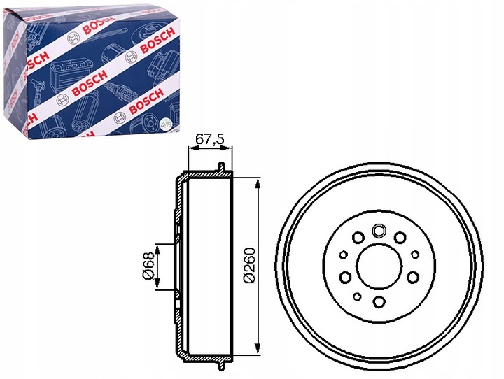 Kpl. bębnów hamulcowych 2szt. (lewy + prawy, na jedną oś pojazdu) TYŁ pasuje do: VW CALIFORNIA T4 CAMPER, TRANSPORTER IV 1.8-2.5D 07.90-06.03 BOSCH