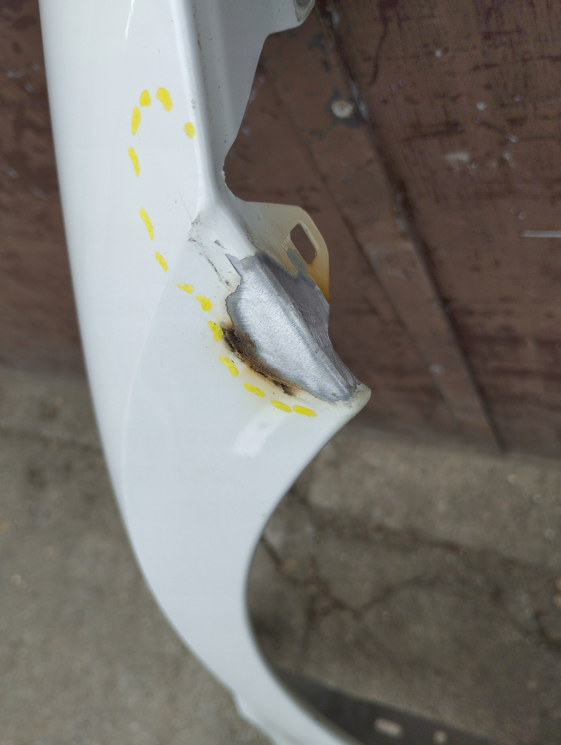 Błotnik prawy przód BMW M2 G87. Błotnik spawany, naprawiany w zaznaczonym miejscu.