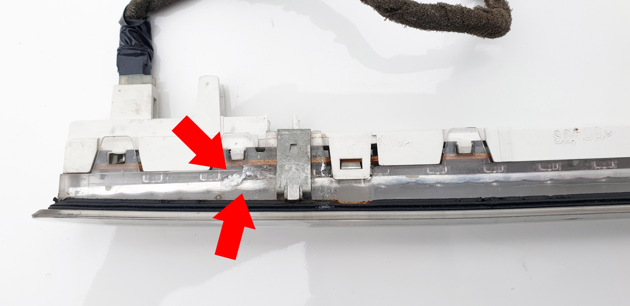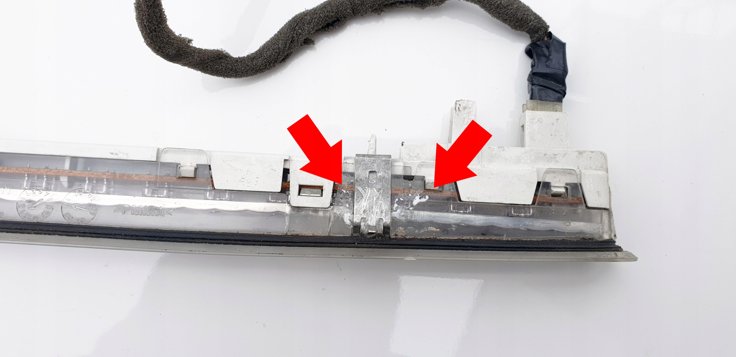 Światło stop, co widać na zdjęciach, pod względem świecenia w 100% sprawne - wszystkie diody bardzo ładnie świecą. Technicznie wszystkie mocowania są, ale niestety w jednym miejscu, przy jednej blaszce, przy demontażu, lekko pękła obudowa - zostało to sklejone (widać takie "białe ślady"), ale uczciwie informuję. Z zewnątrz klosz jak widać cały. W zestawie również wtyczka z kawałkiem wiązki. Światło oczywiście oryginalne co widać na zdjęciach.