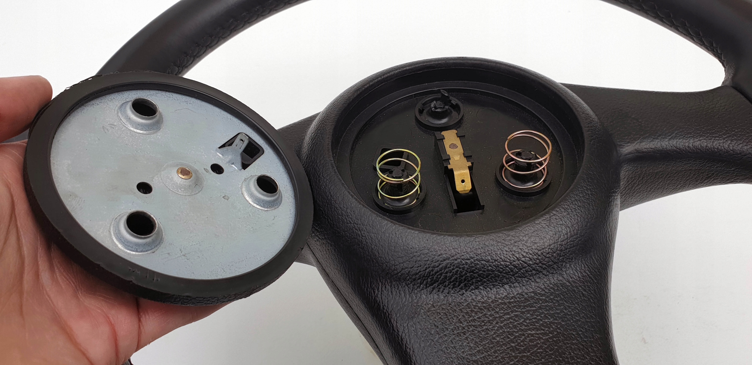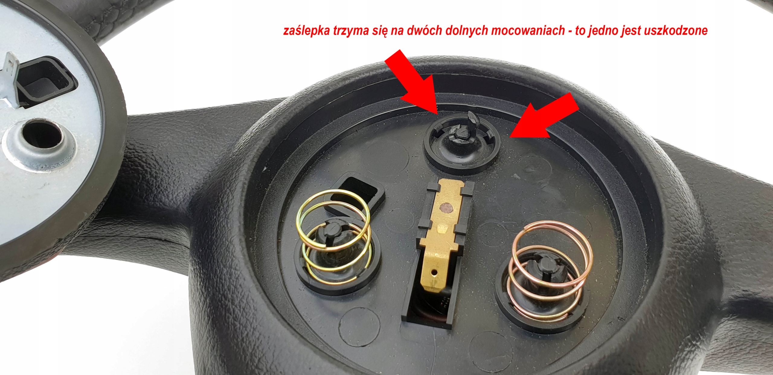 Kierownica ogólnie w ładnym stanie. Skóra cała, nie jest szorstka czy powycierana. Nie zauważyłem również jakiś odbarwień. Oczywiście jakieś małe wgniotki po obrączce czy ryski się znajdą, ale nie ma tragedii. Szwy wszystkie całe, nic nie puściło. Kierownica prosta, sztywna - nie okręca się na drucie. Taśma okej, nie zauważyłem jakiś uszkodzeń. W zasadzie jedyne do czego można się mocniej doczepić to zaślepka klaksonu - jest ona mocowana na trzy zatrzaski i niestety jeden jest uszkodzony (zaznaczyłem to na zdjęciach czerwonymi strzałkami). Zaślepka normalnie wchodzi w dwa pozostałe, ale czasem przy "naciśnięciu na klakson", potrafi "delikatnie odskoczyć" przez brak tego jednego mocowania - że tak napiszę, sama z siebie nie odskakuje co też widać na pozostałych zdjęciach - siedzi dość dobrze.
