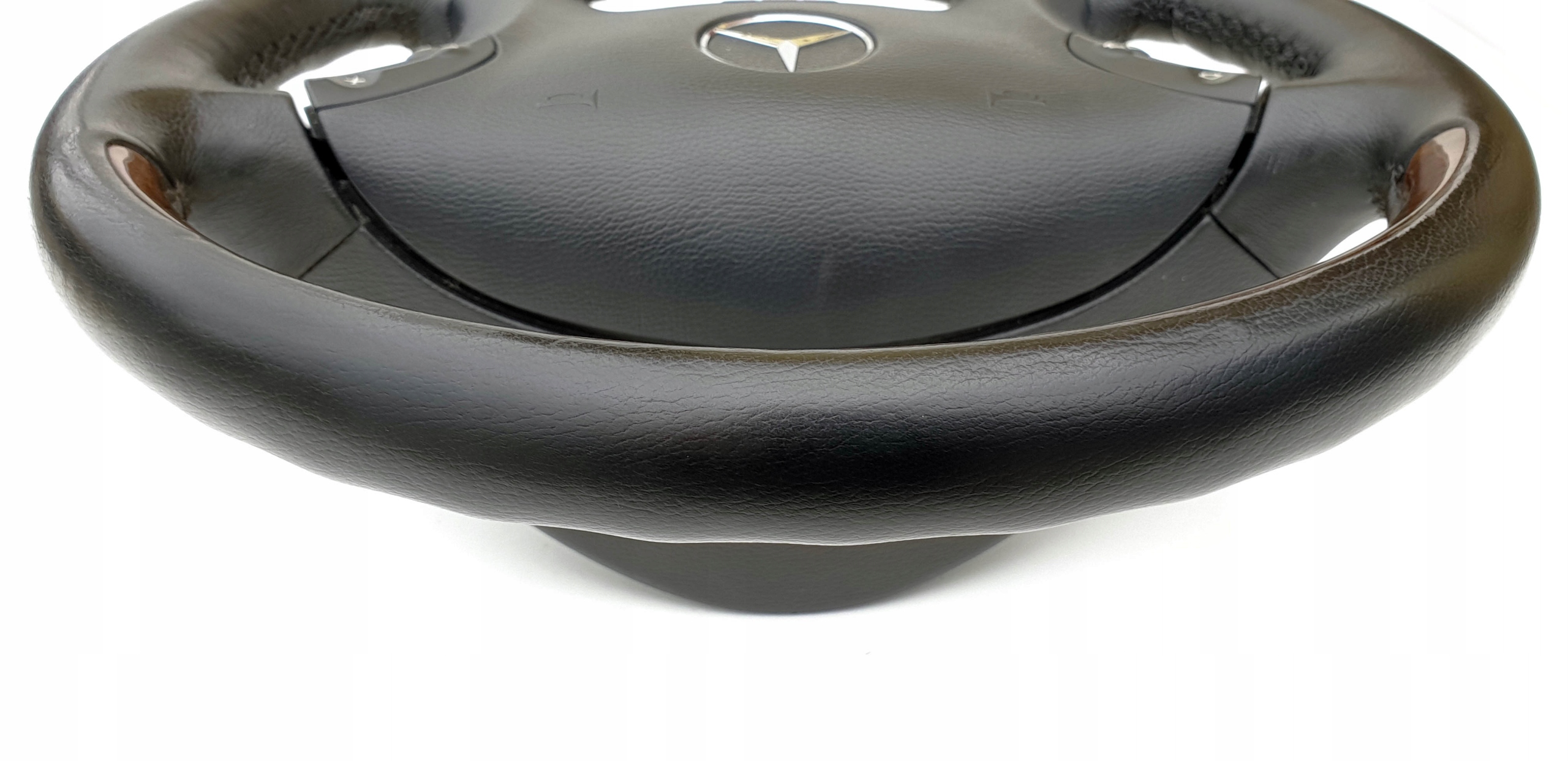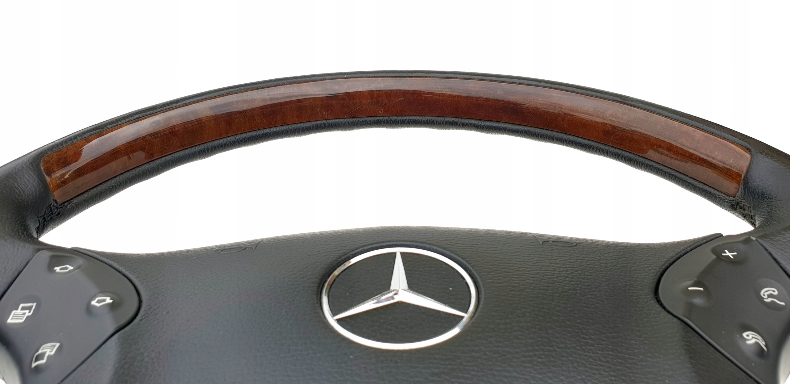 Przedmiotem ogłoszenia jest skórzana (czarna, podkreślam, że nie jest to szary kolor) kierownica z poduszką do Mercedesa W203. Jak widać jest to wersja wzbogacona o dekory drewniane.