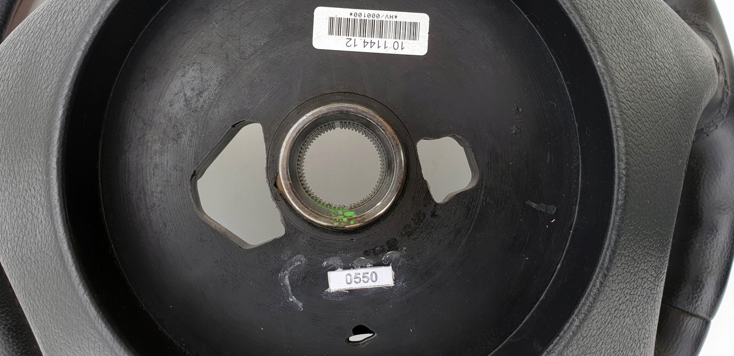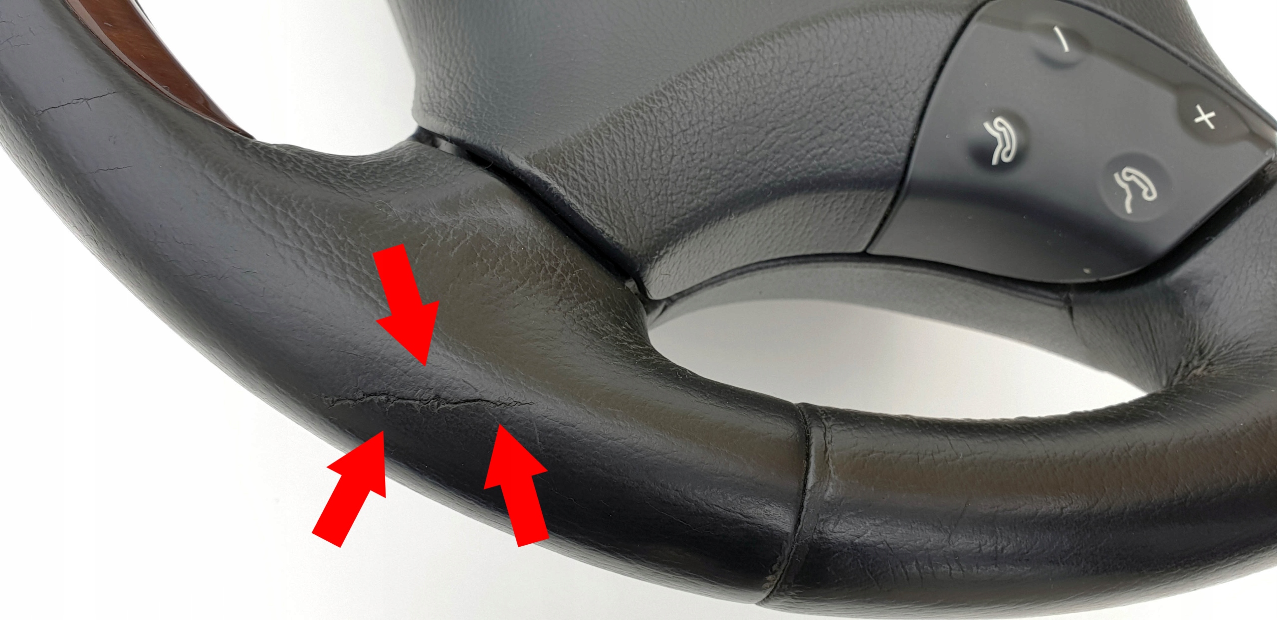 Kierownica ogólnie ładna choć nie jest idealna. Skóra fajna, delikatna w dotyku. Jak widać jest jeszcze dość ładnie widoczna struktura skóry. W zasadzie jedyny, tak większy defekt, posiada mniej więcej na godz. 17:00 - proszę zobaczyć, że jest tam rysa, a nawet przecięcie/pęknięcie skóry (zaznaczone na jednym zdjęciu czerwonymi strzałkami). Szwy wszystkie całe, nic nie puściło. Elementy drewniane bardzo ładne, całe, nie są popękane. Poduszka ładna, przyciski multifunkcji również.