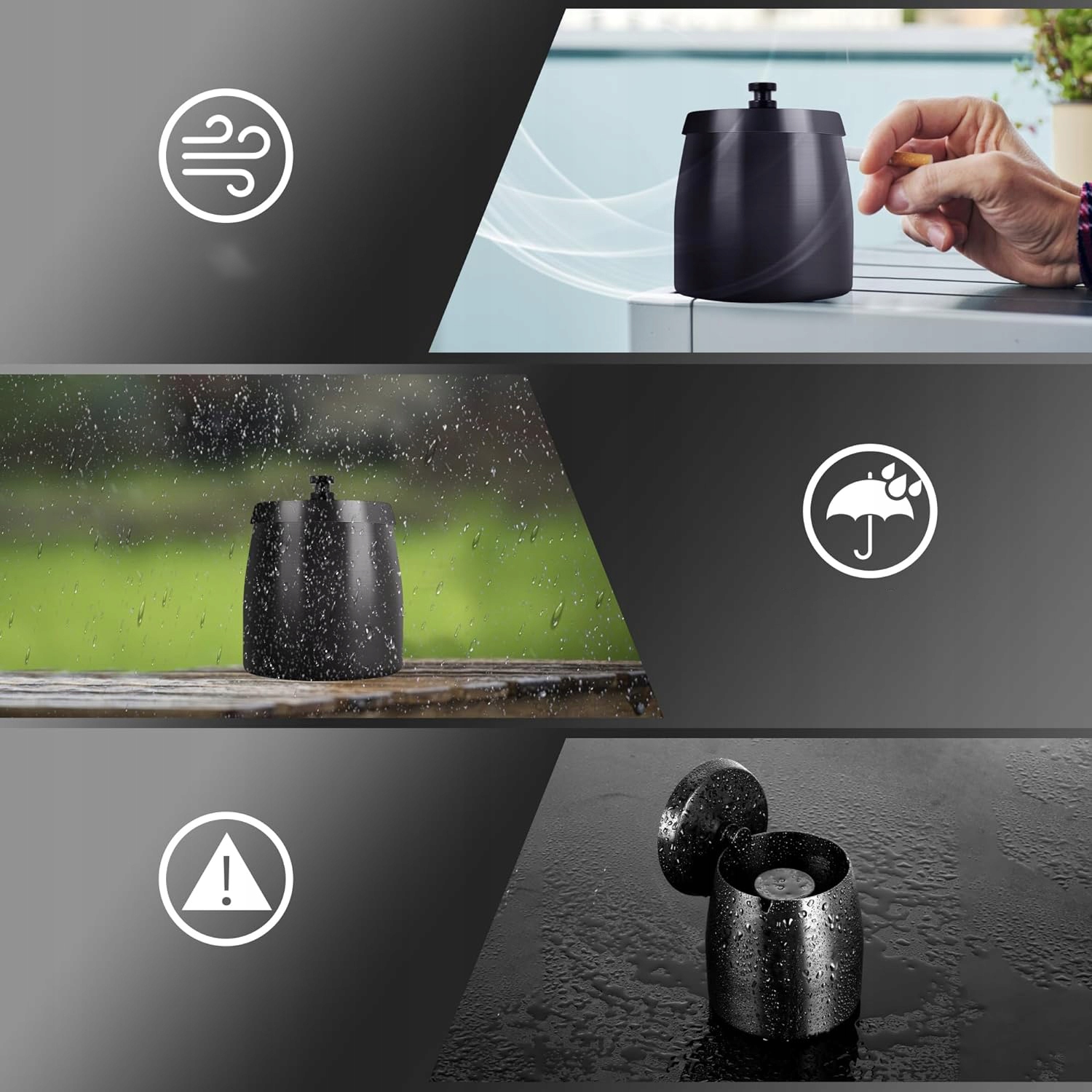 Odporna na warunki atmosferyczne popielniczka zewnętrzna: Aby wytrzymać różne warunki pogodowe na zewnątrz, popielniczka na balkon ma stożkową konstrukcję z nisko położonym środkiem ciężkości. Unikalna konstrukcja i zakryta konstrukcja są odporne na wiatr i deszcz i niełatwo je zdmuchnąć/przewrócić, idealne do użytku na balkonie lub na zewnątrz.