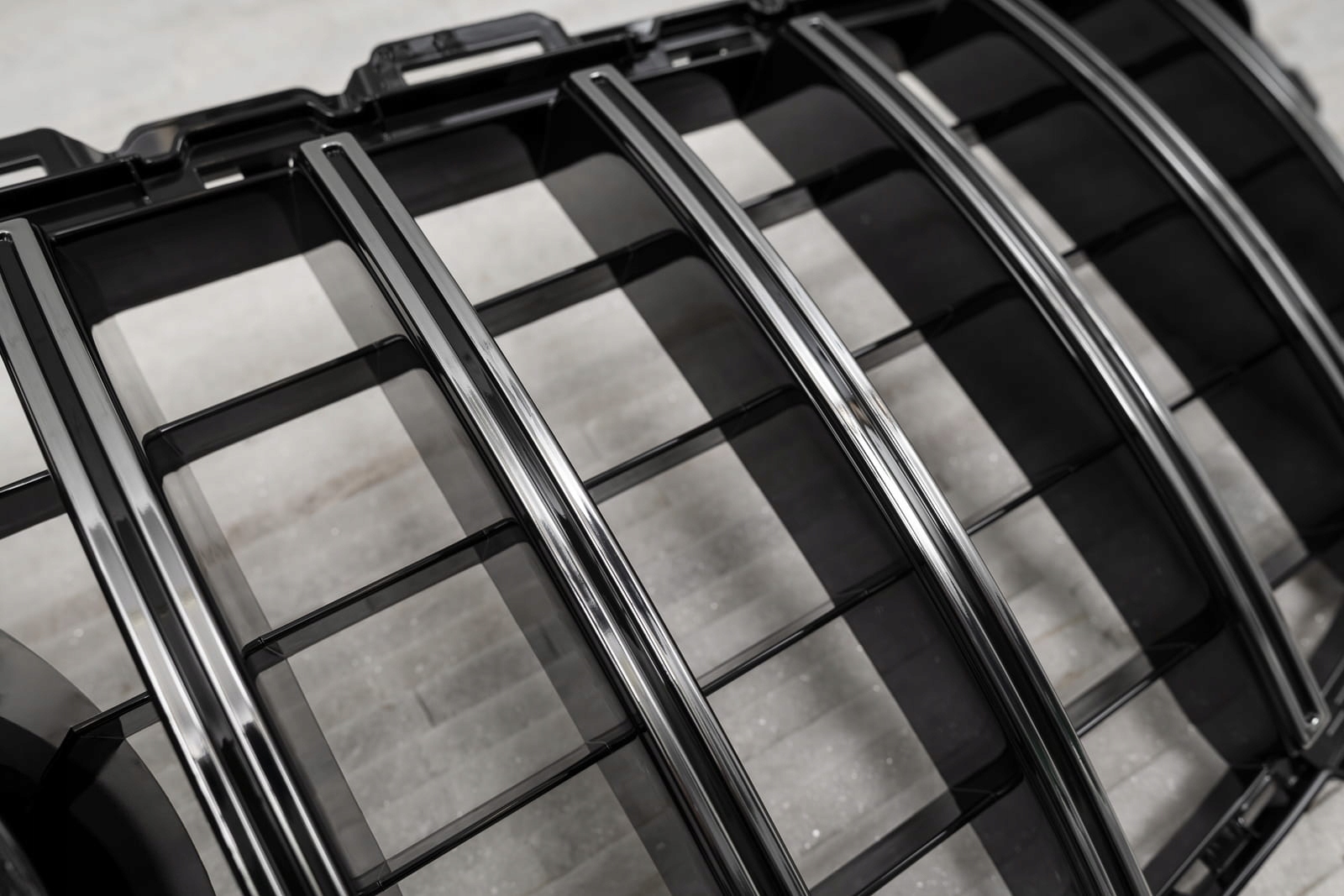 Dedykowany grill zaprojektowany został w stylu charakterystycznym dla samochodów z segmentu GT. Kratka grilla ozdobiona została szerokimi, chromowanymi poprzeczkami, które nieodzownie przywodzą na myśl budzące respekt, pełne mocy samochody z najwyższej półki. Element zachwyca sportowym charakterem, a połysk chromowanych elementów dodaje mu elegancji - dzięki czemu doskonale współgra z imponującym designem Mercedesa.