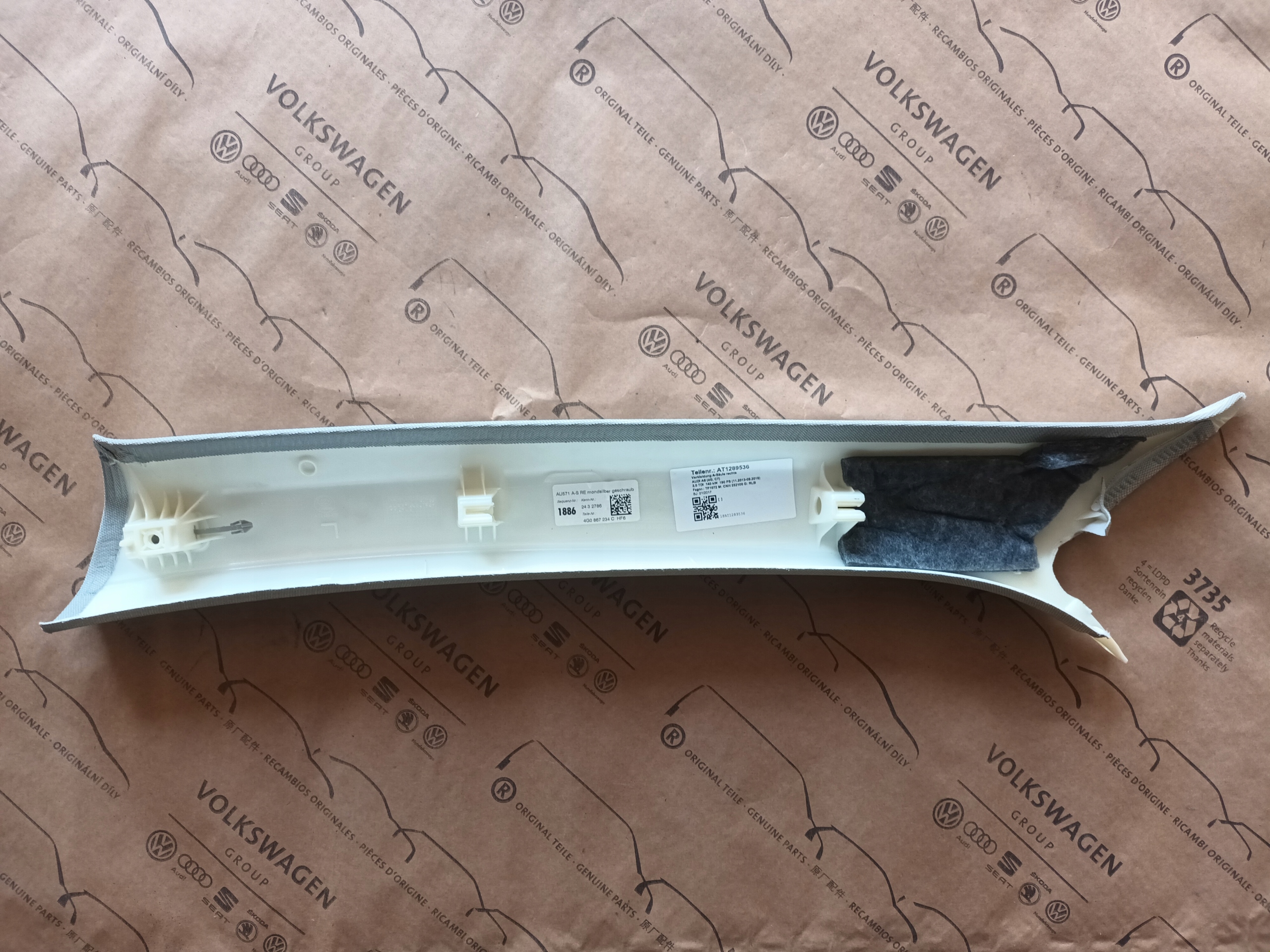 Osłona słupka prawa 4G0867234C HF6 do Audi A6 C7 4G Lift, cena za sztukę. Osłona pochodzi z auta testowego ( nie z auta powypadkowego) Audi A6 C7 4G Sedan LIFT 2017 r z udokumentowanym przebiegiem 28 km, osłona w bardzo ładnym stanie, rok produkcji 2017 roku, posiadamy większość osłon przód tył do tego modelu. Nasze części pochodzą z legalnego źródła więc można je kodować w dowolnym salonie Audi maja również gwarancje przebiegu i pochodzenia auta z którego zostały wymontowane. Sprzedajemy części widoczne na zdjęciach, możliwość dostawy, posiadamy taki sam komplet na przód.