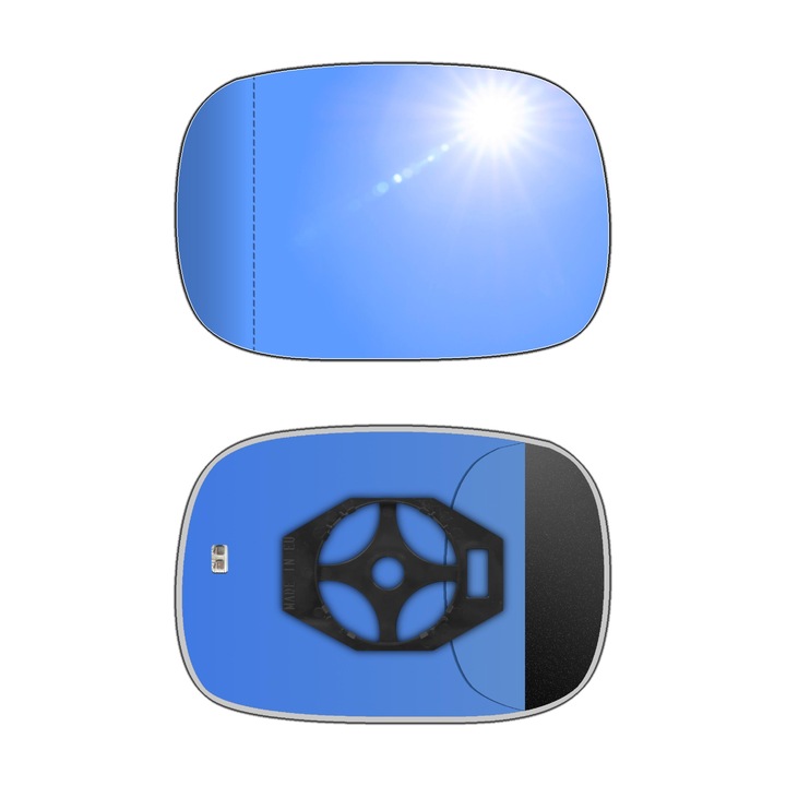 Antyrefleksyjny lewy ogrzewany wkład asferyczny lusterka - z plastikiem montażowym typu E0 (tzw. EURO) i niebieskim oddalającym szkłem z grzałką