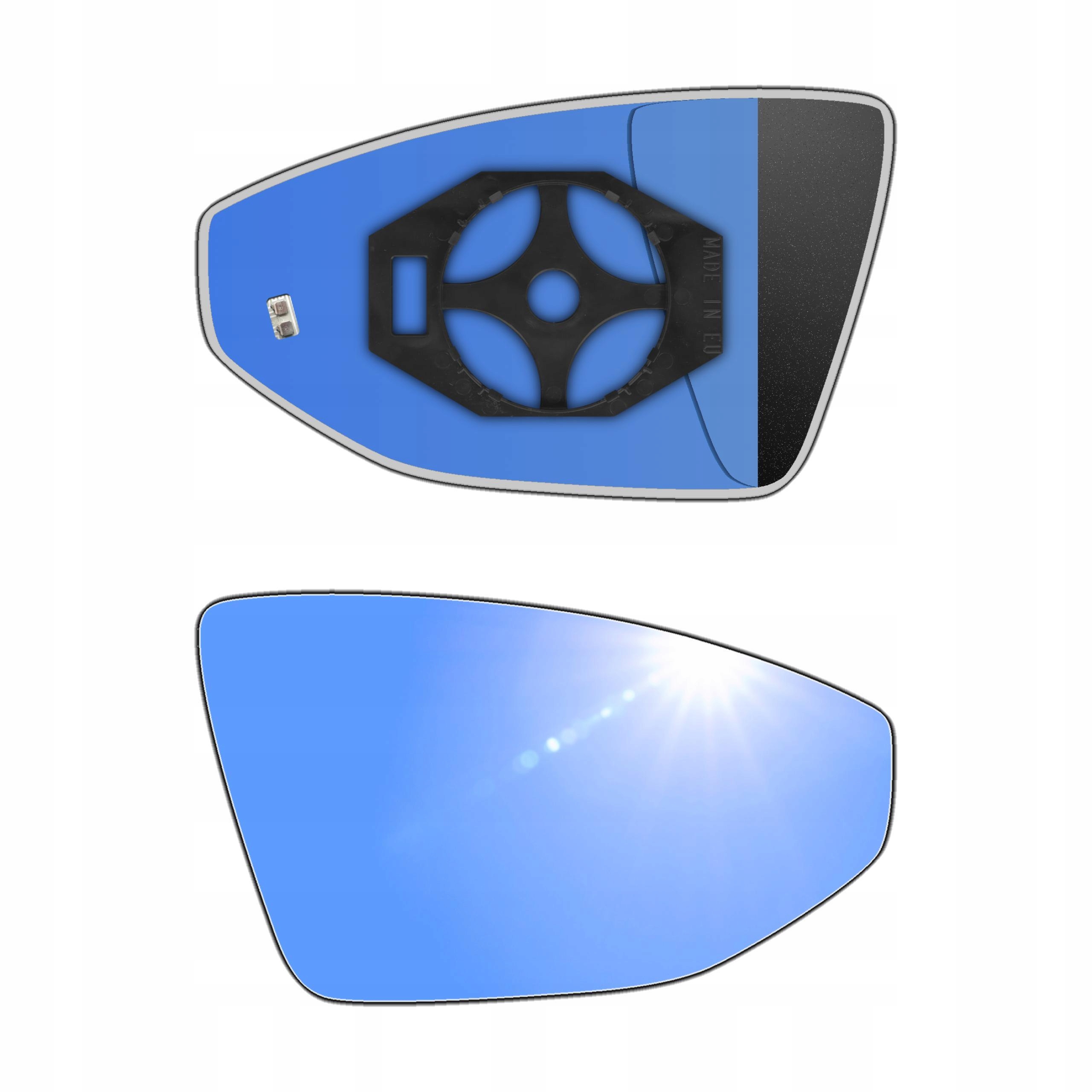 Prawy ogrzewany wkład sferyczny lusterka - z plastikiem montażowym typu E0 (tzw. EURO) i niebieskim oddalającym szkłem z grzałką