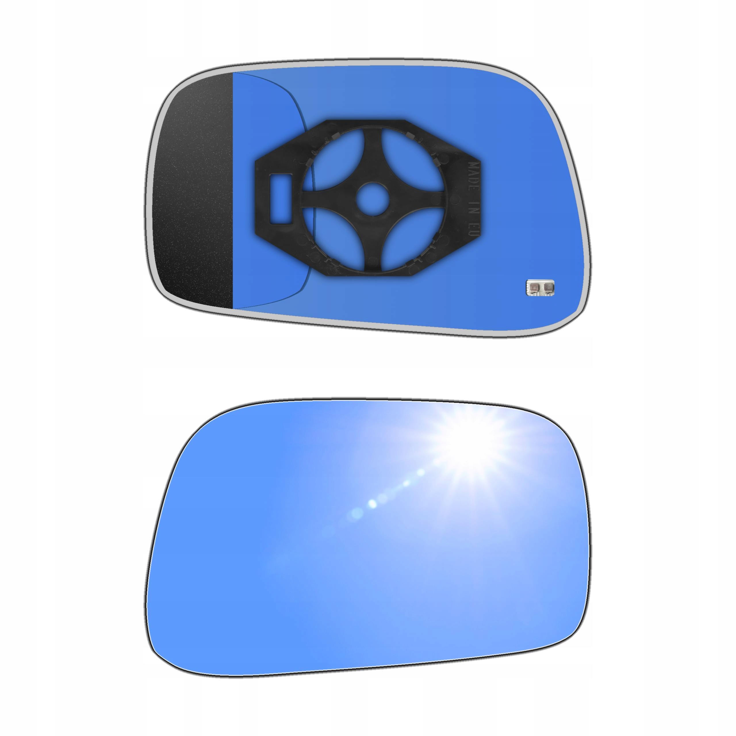 Prawy ogrzewany wkład sferyczny lusterka - z plastikiem montażowym typu E0 (tzw. EURO) i niebieskim oddalającym szkłem z grzałką