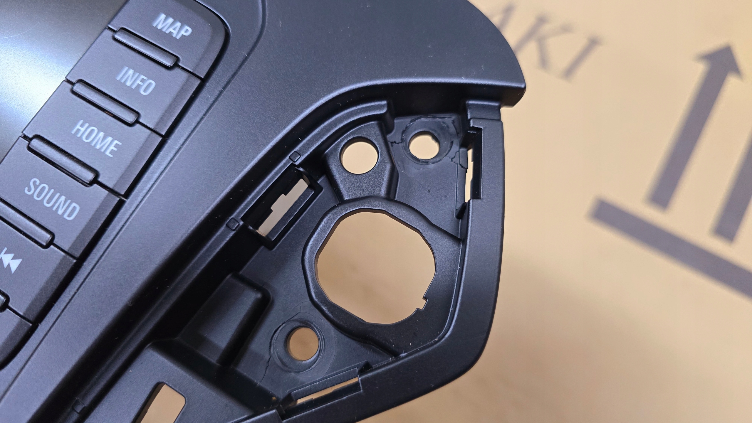 Z prawej strony w miejscu przykręcania wkrętów są pęknięcia lecz nie będzie to przeszkadzać w użytkowaniu, ponieważ nawigacja głównie trzyma się w koszu.