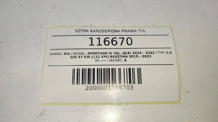 Przedmiot aukcji: SZYBA KAROSERYJNA PRAWA TYŁ KIA SPORTAGE IV 2016 AS3 CIEMNA PRZYCIEMNIONA