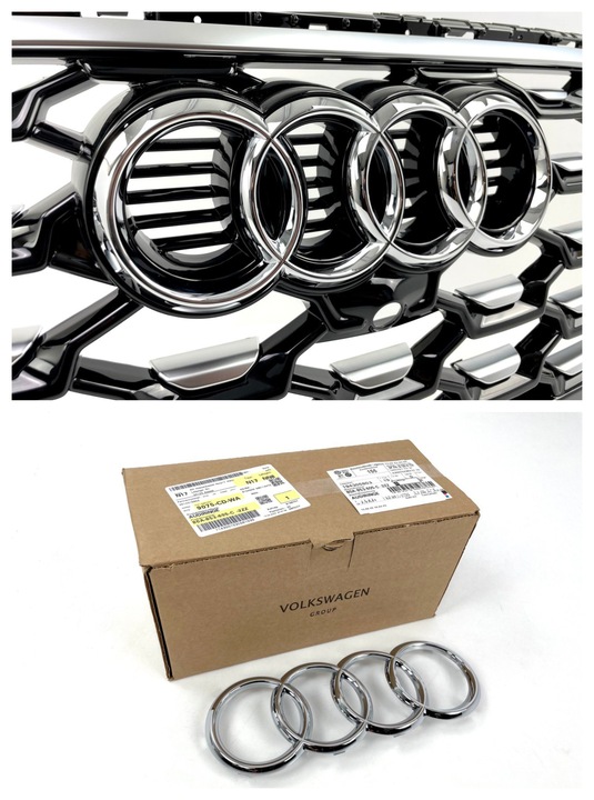 - Atrapa kompletna z nowym znaczkiem Audi OEM 80A853605CT94 oraz z europejską podstawą tablicy rejestracyjnej