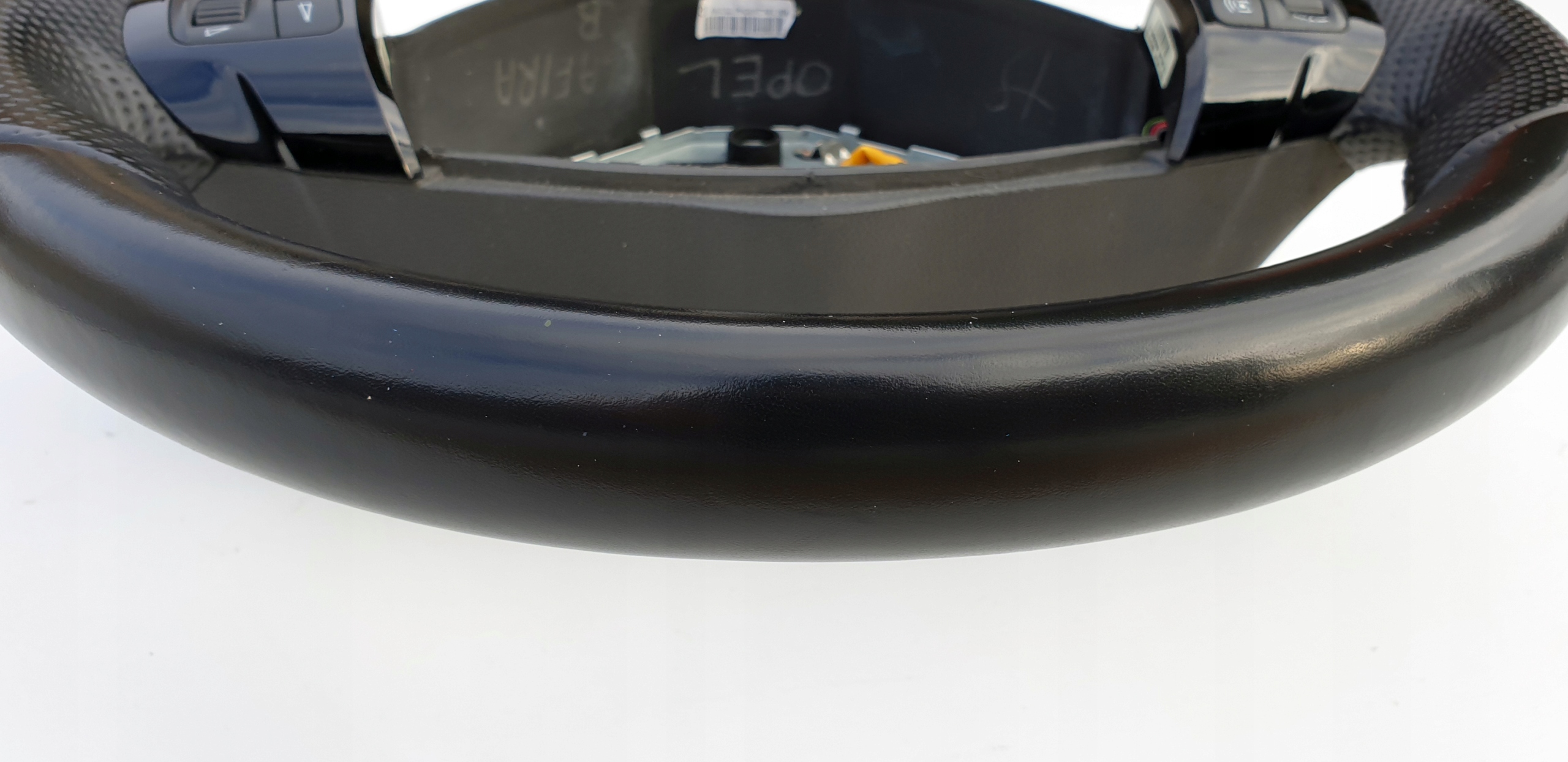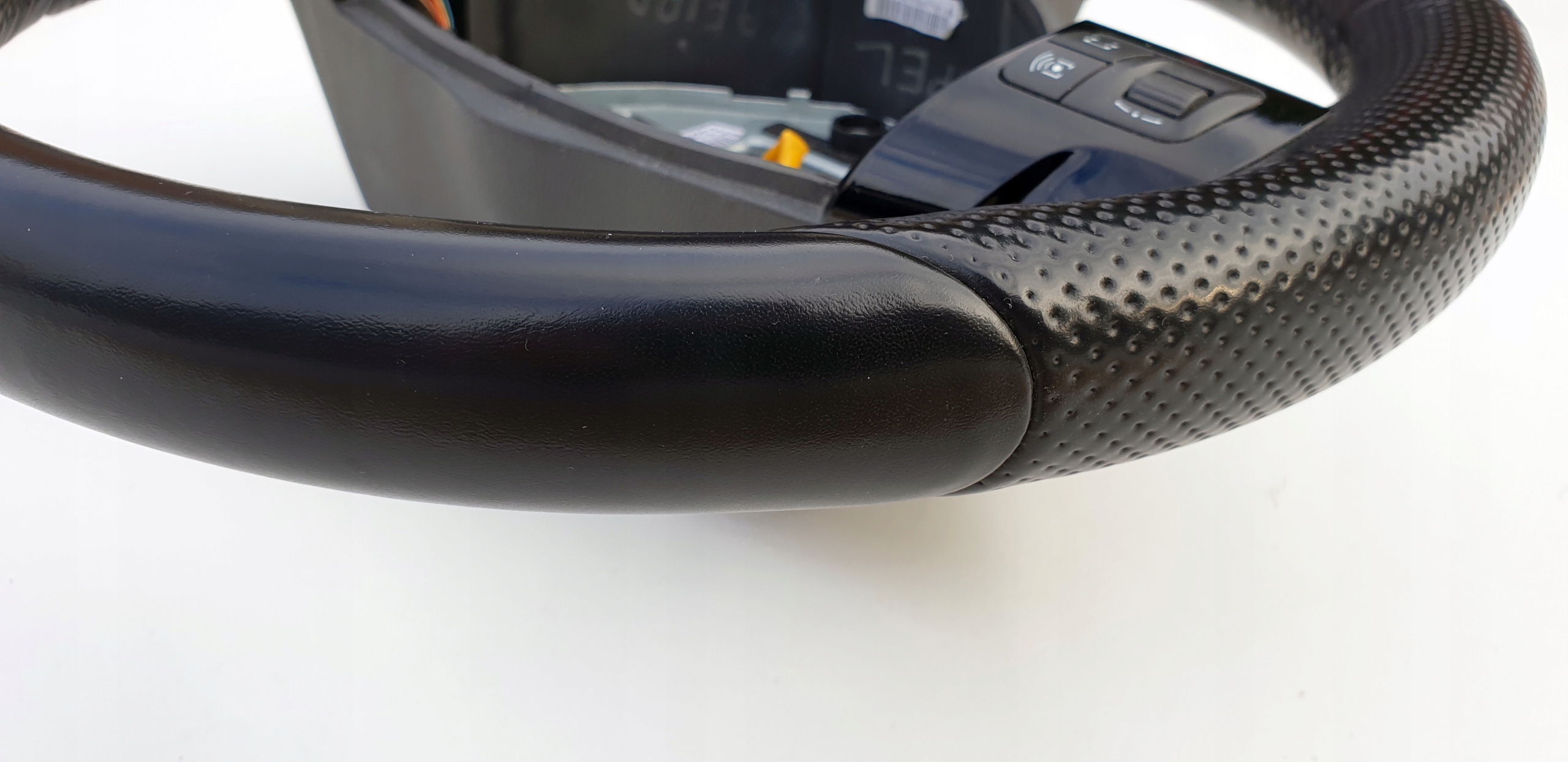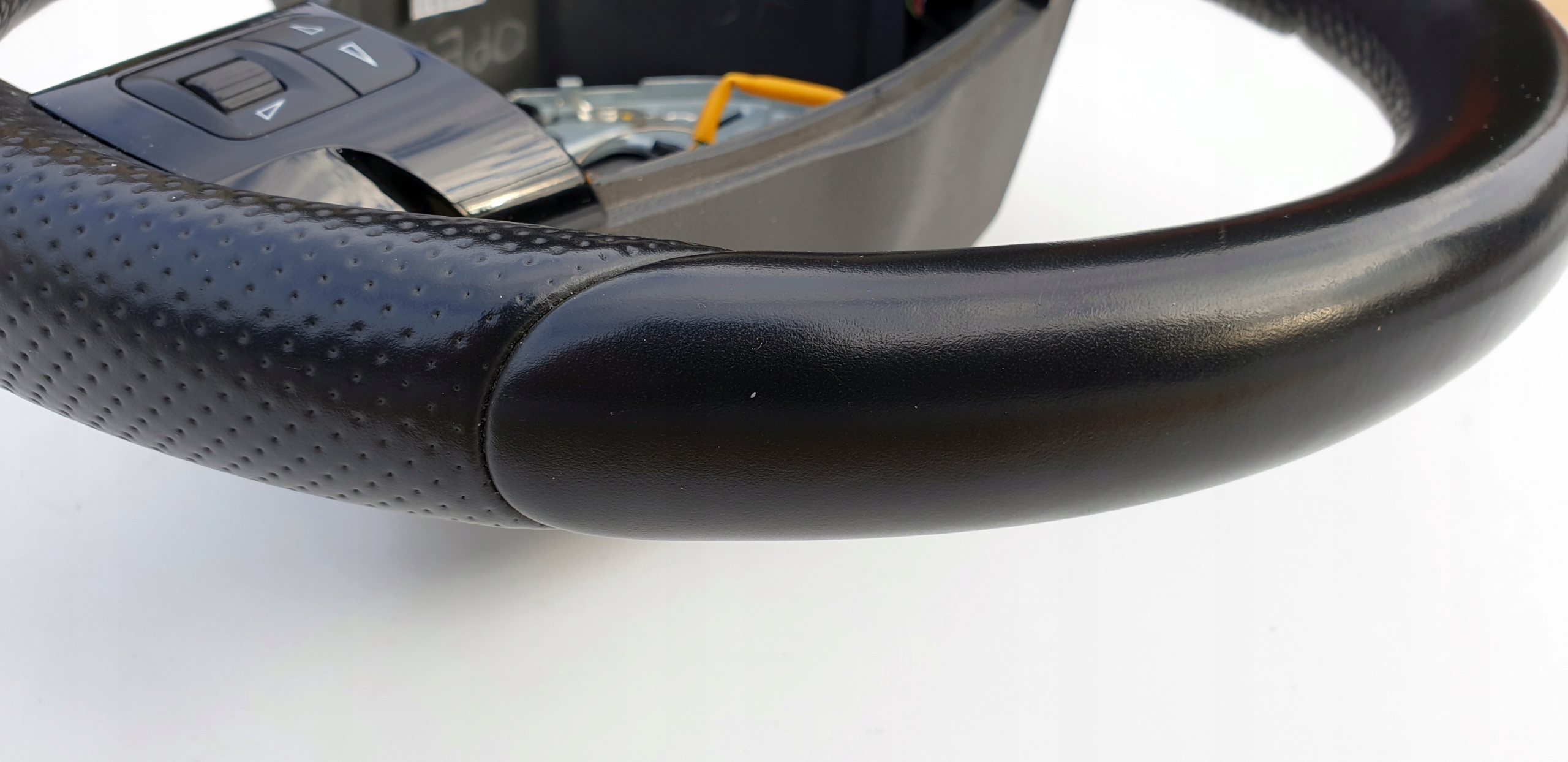 Kierownica bardzo ładna. Posiada jakieś drobne odkształcenia (np. od paznokcia, obrączki, spodni itp.), niemniej są to bardzo drobne odkształcenia. Sama skóra nie jest powycierana, przetarta, nie jest też spękana co niestety dzisiaj jest normą tych kierownic - słońce i dotyk rąk swoje robi. Fajna delikatna (mięsista) w dotyku. Szwy wszystkie całe. Multifunkcja w pięknym czarnym pomysłu, tzw. piano black. Rolki sterowania jak widać ładne choć ta po lewo ma ślady użytkowania, nie jest idealna. Kierownica jest tak naprawdę moim "leżakiem garażowym" - planowałem zakup Zafiry B 5 lat temu, ale niestety nie udało się zrealizować celu. Myślę, że warta polecenia. Koszt nowej kierownicy to wydatek przekraczający 3500zł (830 euro).