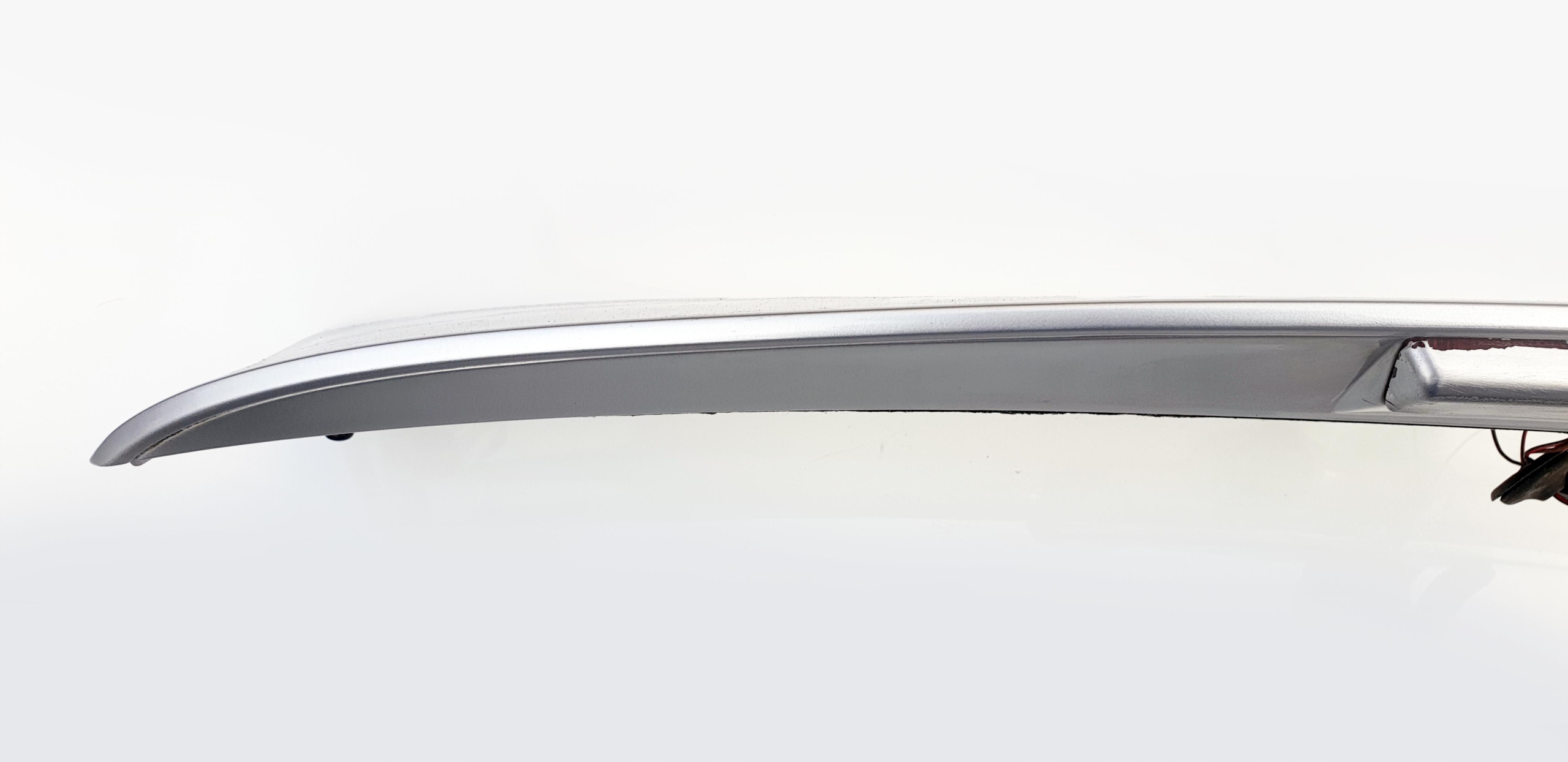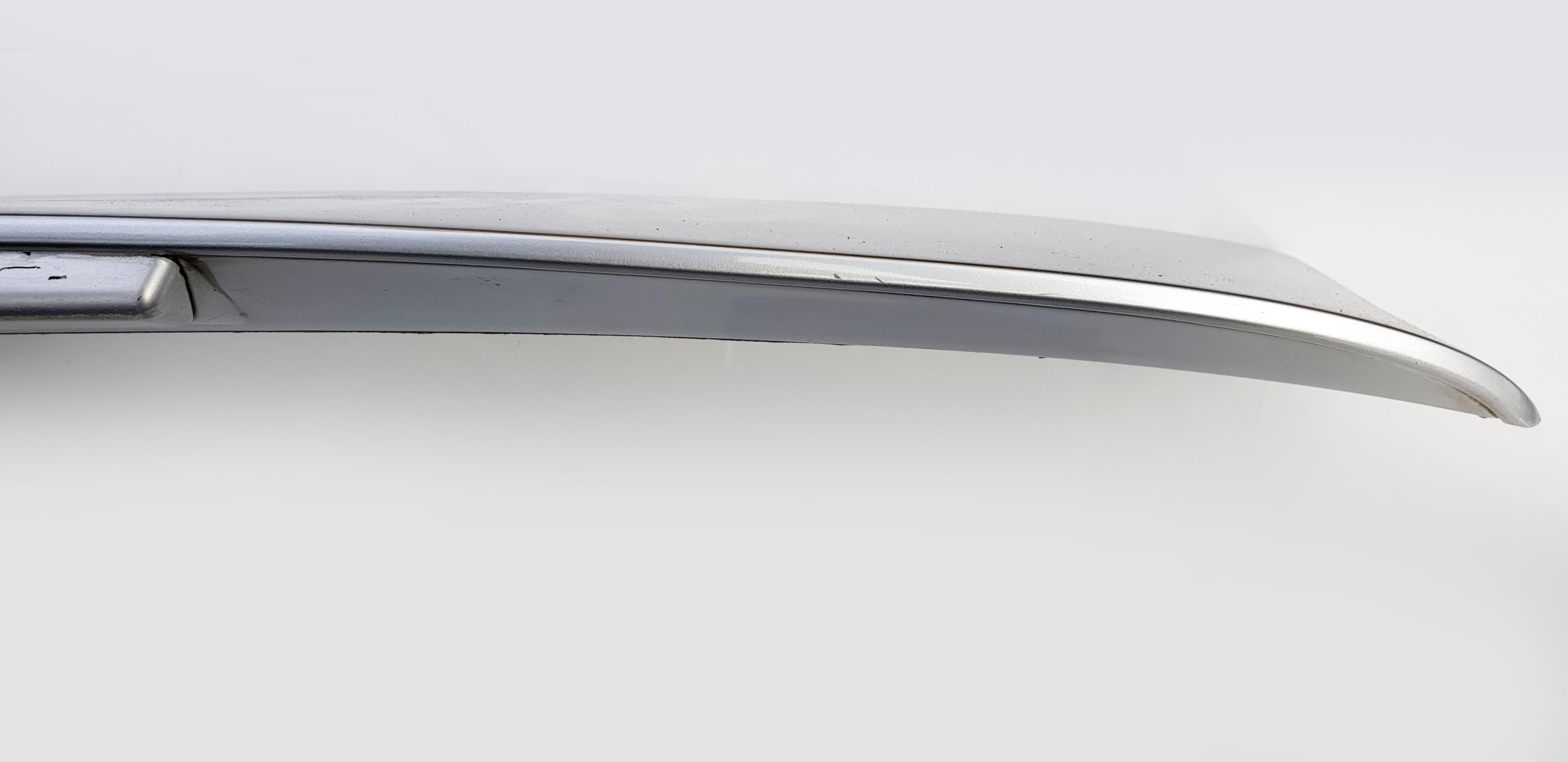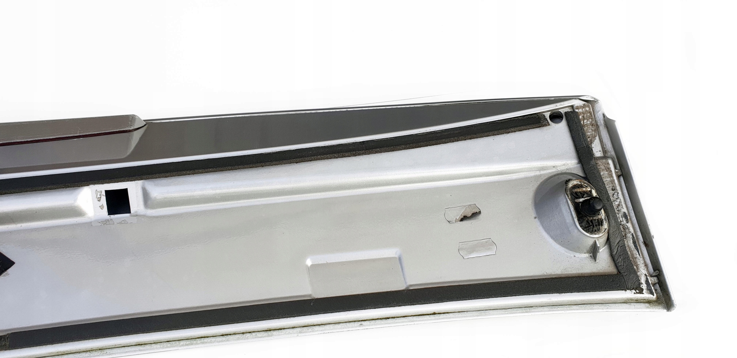 Wizualnie, pod względem lakierniczym, nawet ładna - oczywiście znajdą się odpryski, jakieś ryski, ale osobiście chyba zakładałbym na auto bez wizyty u lakiernika. Kodu lakieru nie jestem w stanie podać, ale wizualnie jest to srebrny metalik, taki pospolity, jasny srebrny metalik (zdjęcia mogą troszkę przekłamywać, bo fotki robione były bardzo wczesną porą przy lekkim słońcu). Niestety największym defektem jest światło stop - jak widać wizualnie jest, ale technicznie... go nie ma, tzn. jest polakierowane. Sprawdzałem "na krótko" czy działa, ale niestety nawet jedna dioda nie zaświeciła. I to jest jednak największy minus tego spoilera. Światło stop albo do regeneracji, albo do przełożenia ze swojego starego. Mocowania są wszystkie całe, są nawet kapturki zaślepiające śruby. Całość jak widać oryginalna, na jednym ze zdjęć są widoczne numery katalogowe i logo Seata.