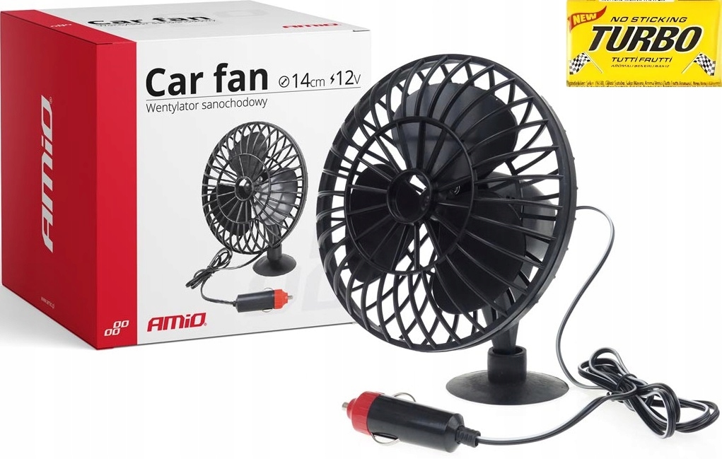 Wentylator samochodowy AMiO miniFAN, posiada przyssawkę dzięki, której zamontujesz go na szybie pojazdu. Zasilany z gniazda zapalniczki samochodu 12V.