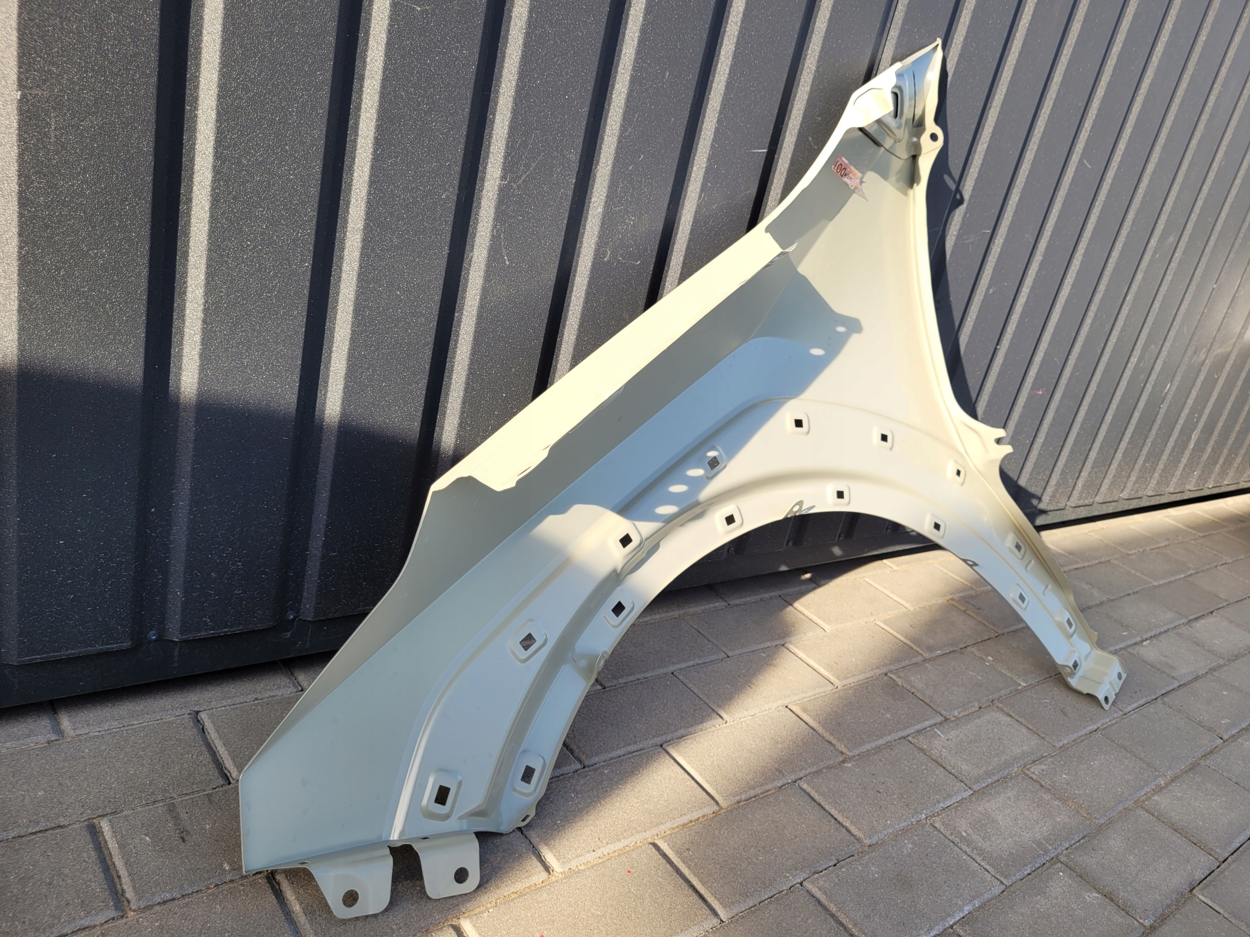 Błotnik fabrycznie nowy, posiada minimalnie zagięty narożnik (szkoda transportowa) co widać na zdjęciach. Poza tym stan bdb, nie naprawiany.