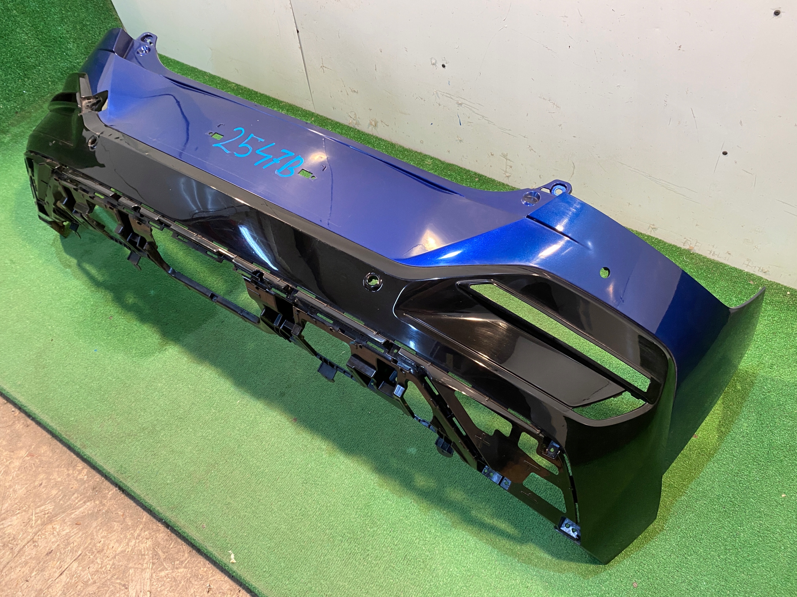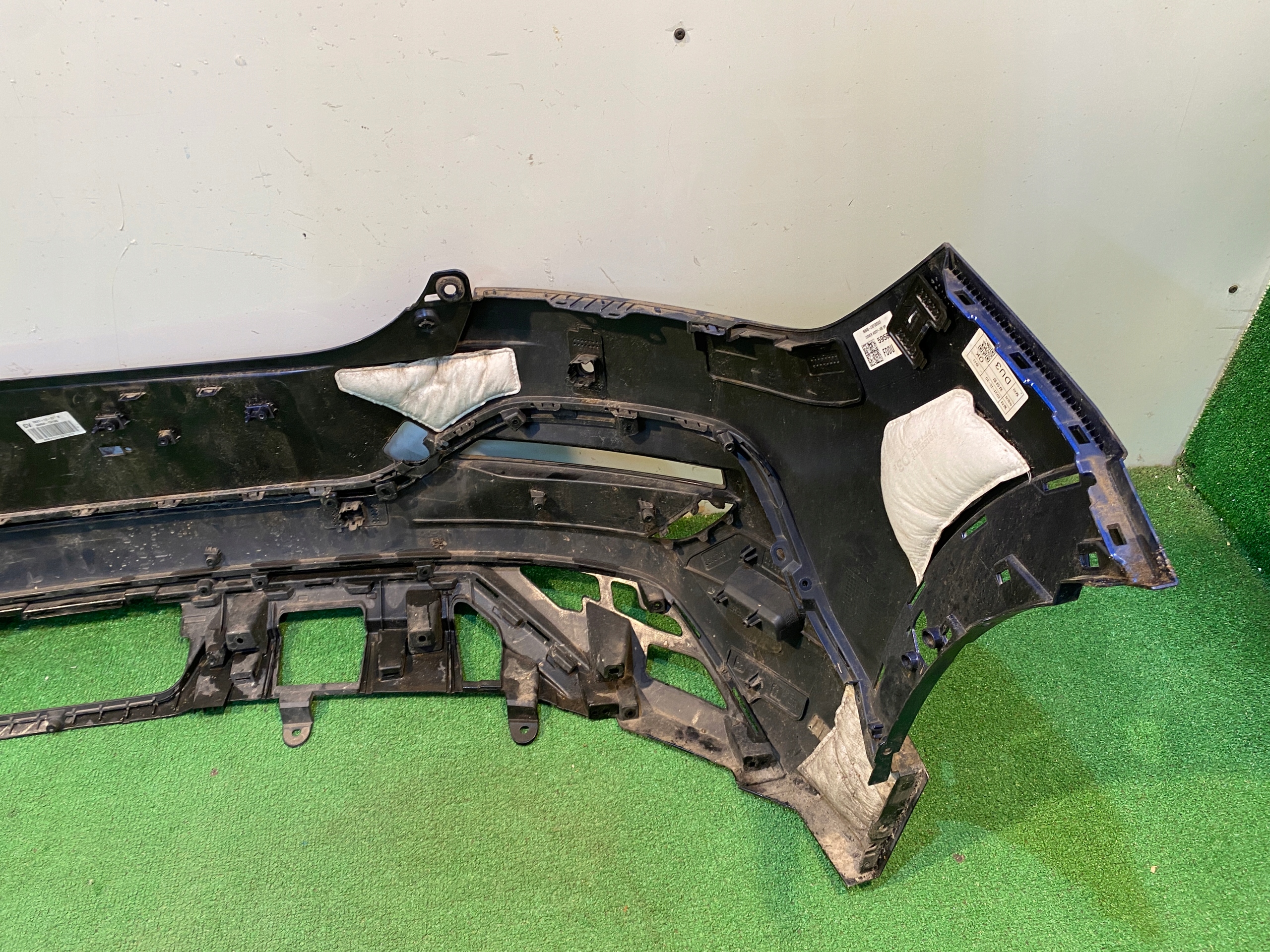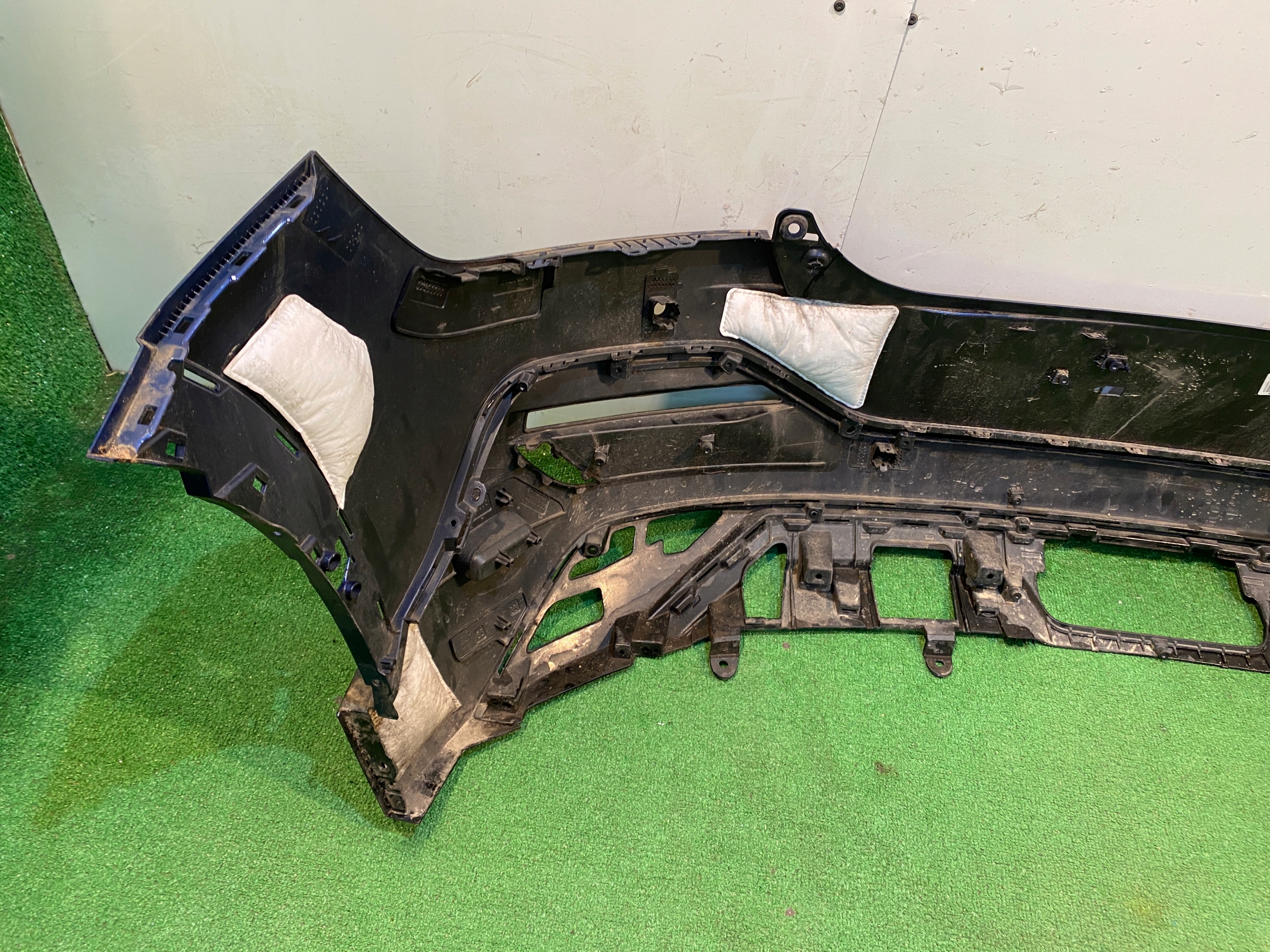 Zderzak bardzo ładny, zadrapany i odciśnięty w miejscach widocznych na zdjęciach. Brak jednego mocowania przy tablicy rejestracyjnej. Wymaga ponownego lakierowania.
