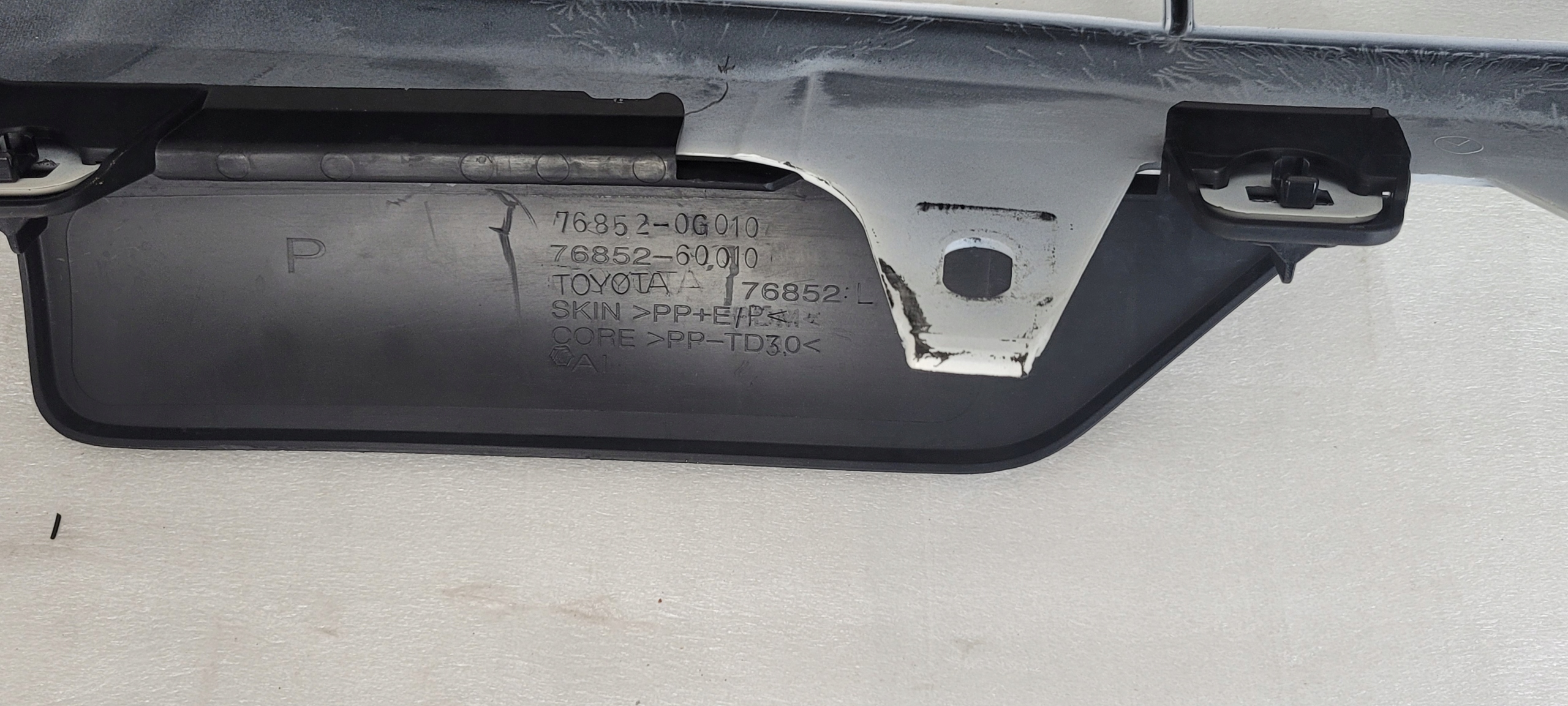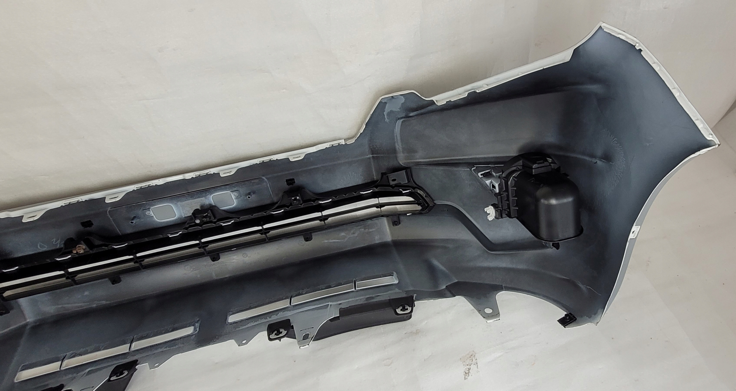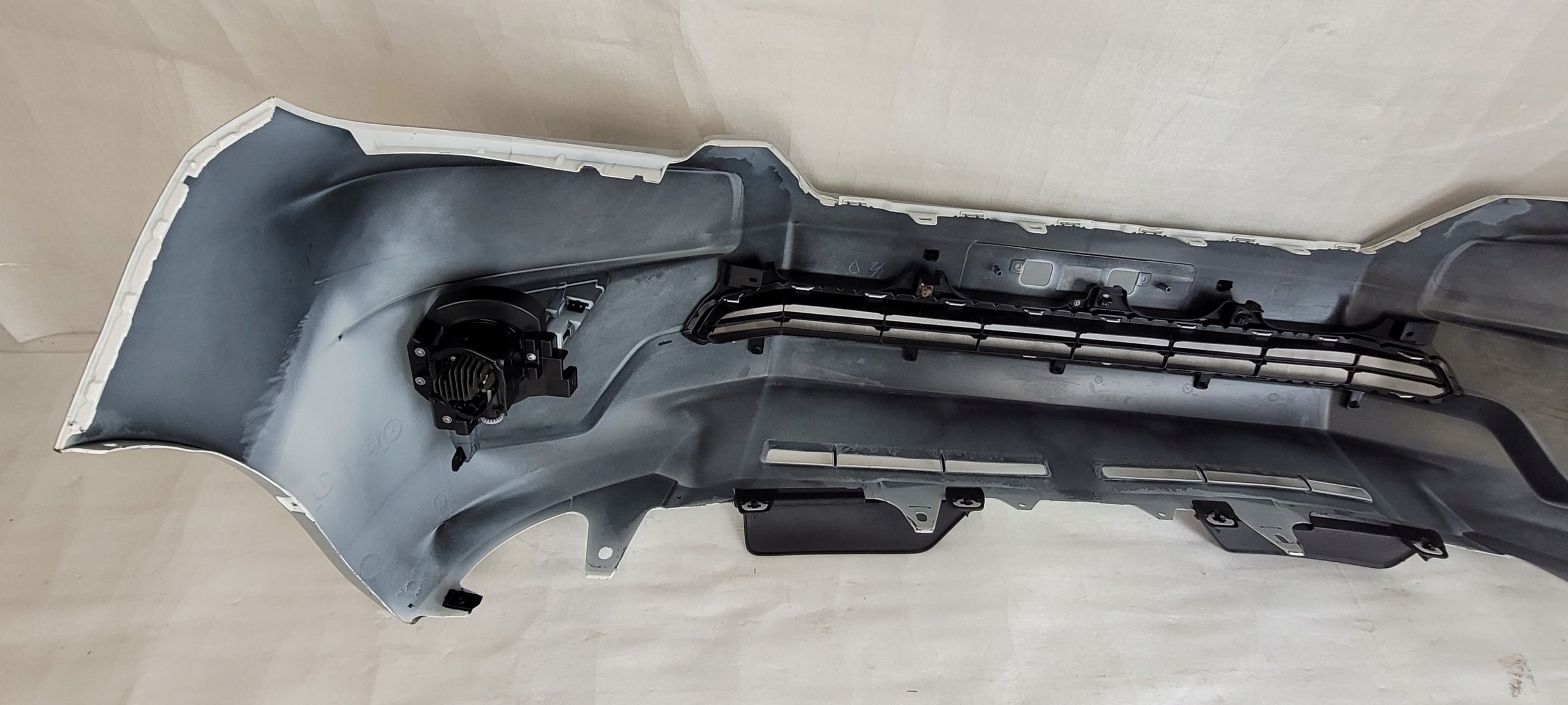 Stan jak na zdjęciach. Zderzak jest oklejony okleiną / folią w kolorze siwym. Pod spodem w kolorze w przybliżeniu białym. Nie znamy kodu lakieru.