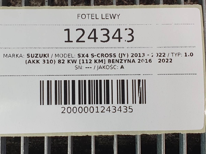 Przedmiot aukcji: FOTEL LEWY PRZÓD KIEROWCY EUROPA CZARNY GRZANY SUZUKI SX4 S-CROSS 2017