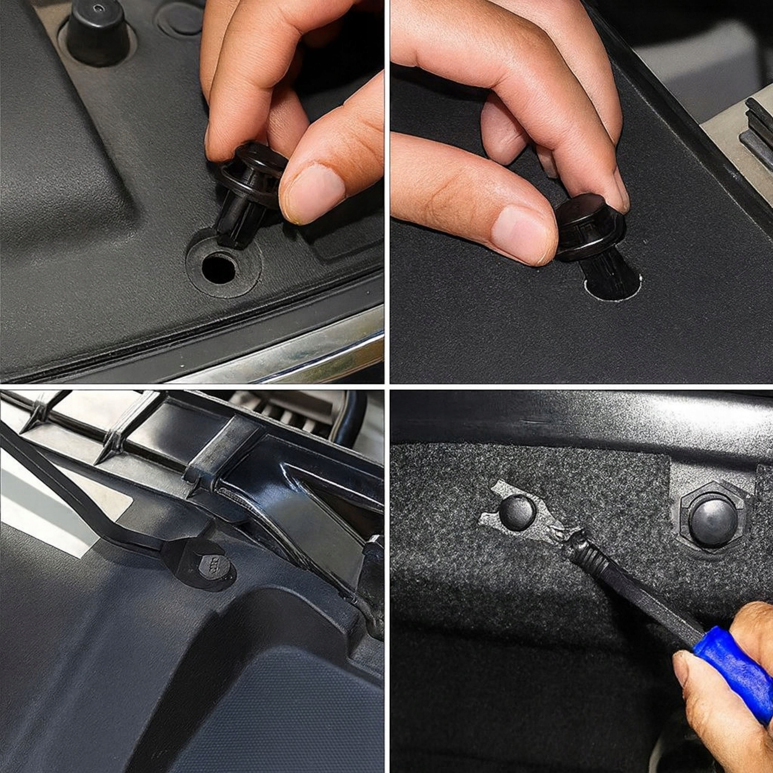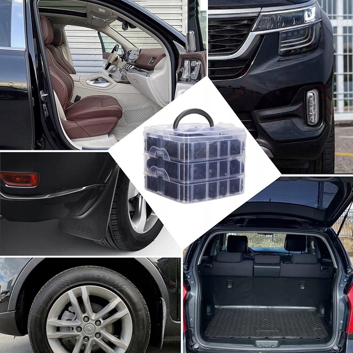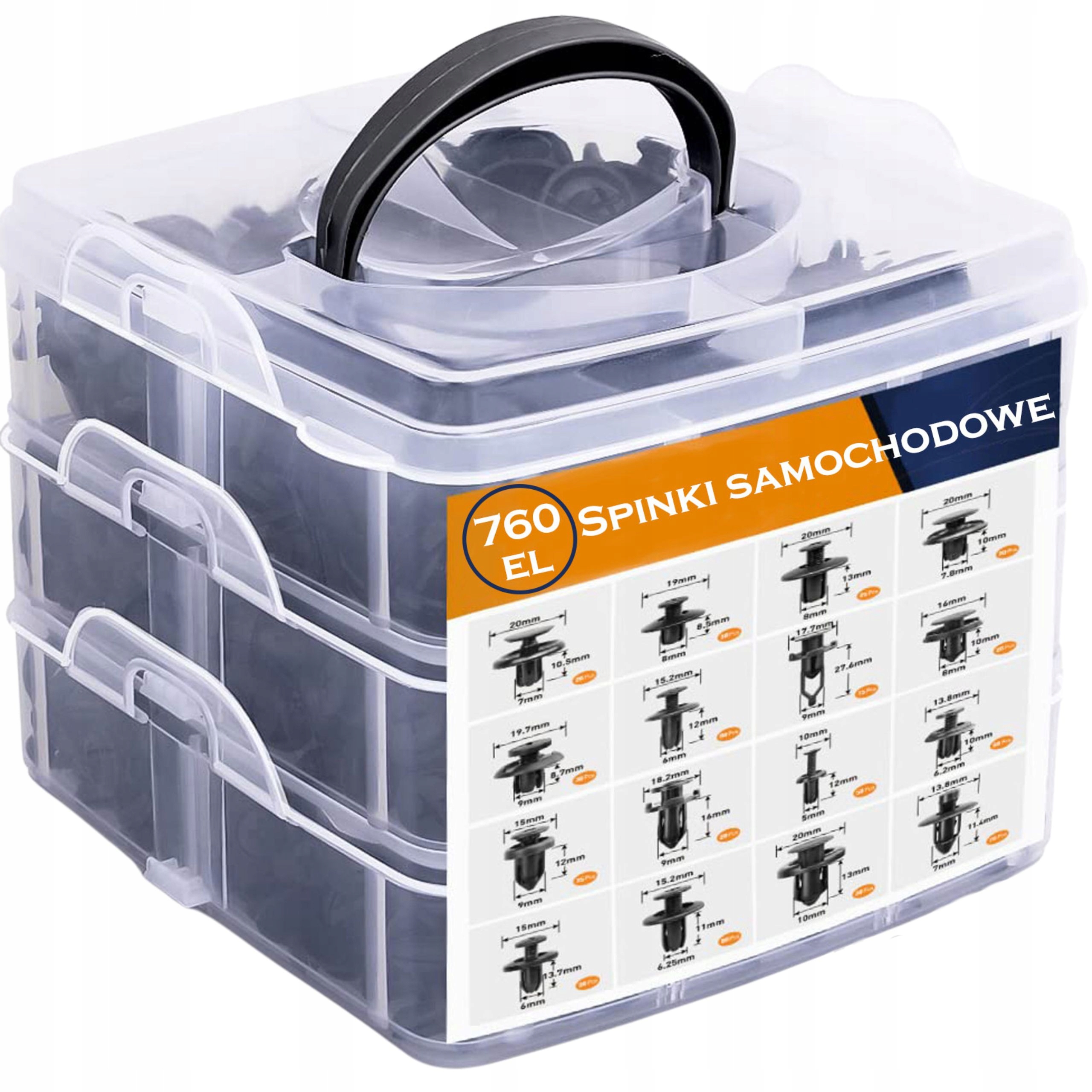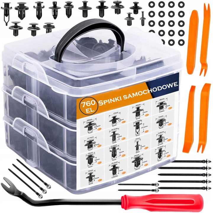 W jednym pudełku masz aż 760 spinek w 16 rozmiarach + praktyczne narzędzia, które pozwolą Ci samodzielnie, szybko i bezpiecznie naprawić tapicerkę, nadkola, podsufitkę czy elementy karoserii.