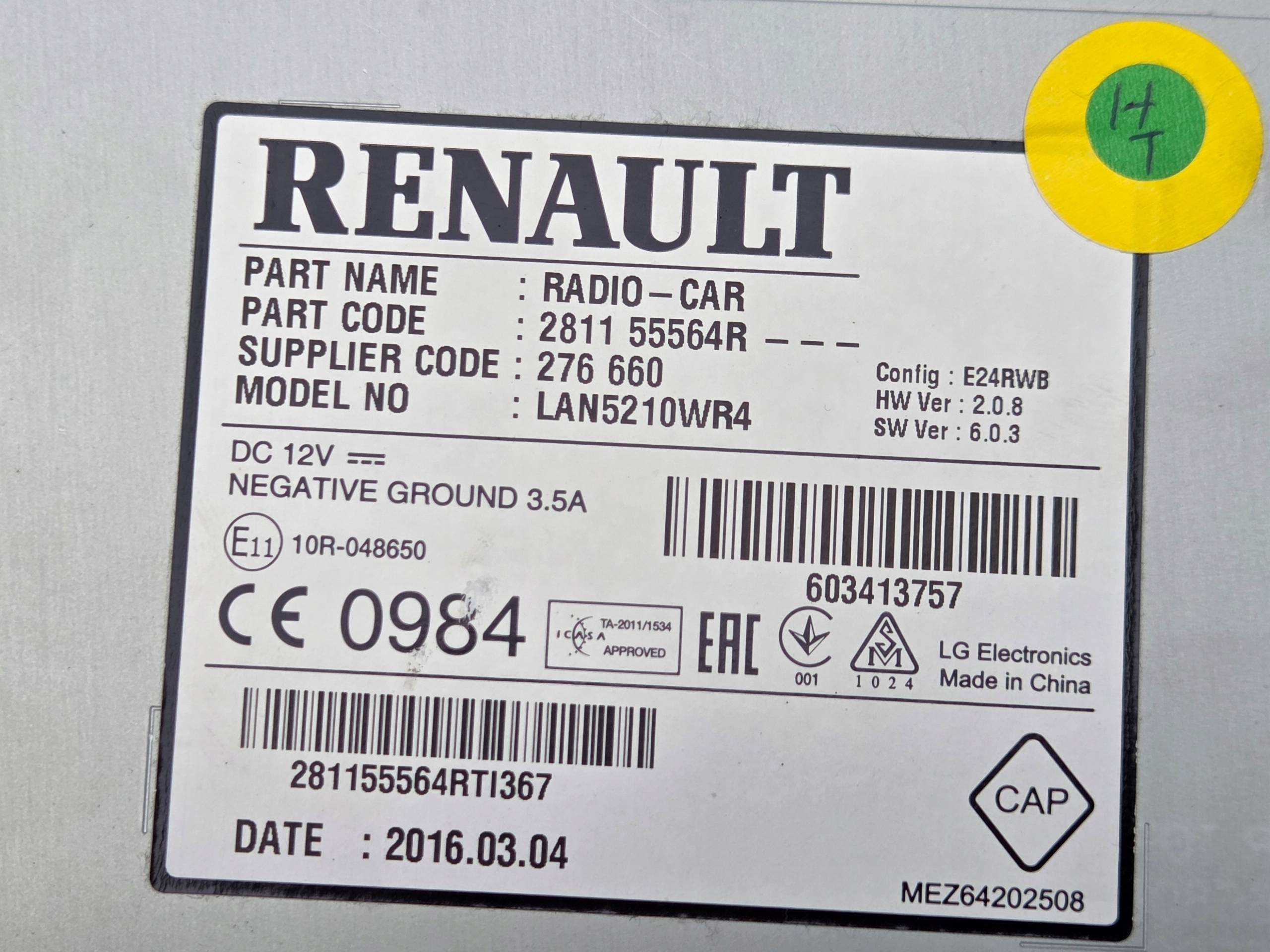 | Каталожний номер запчастини: | 281155564R, LAN5210WR4, RENAULT, CLIO, IV, RADIO, NAWIGACJA, Z, KODEM, 2015r |
