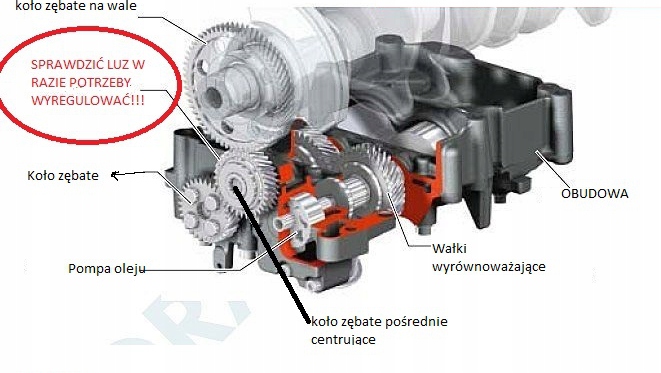 Napęd zębaty jest skonstruowany w taki sposób, że wałki wyrównoważające obracają się dwa razy szybciej niż wał korbowy.