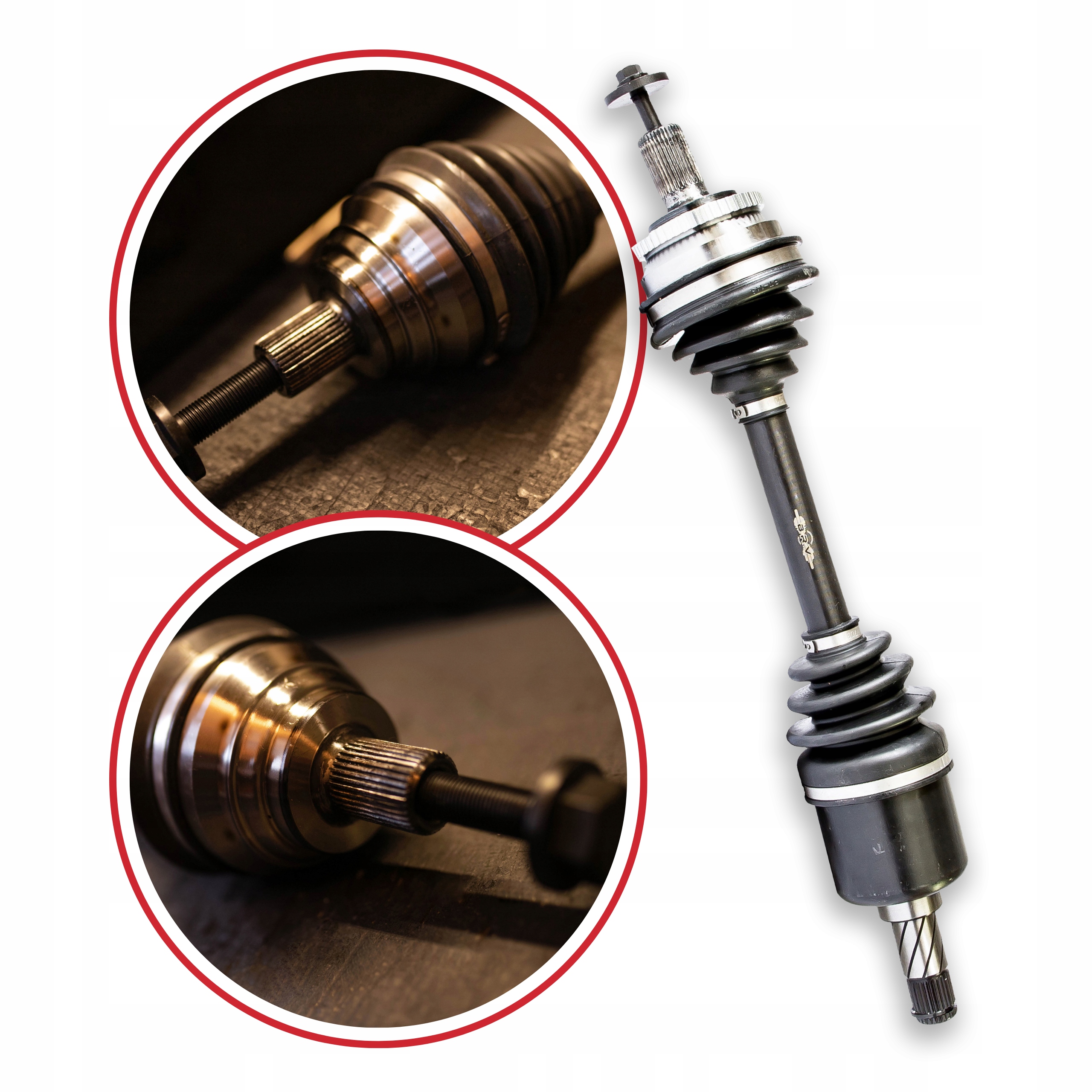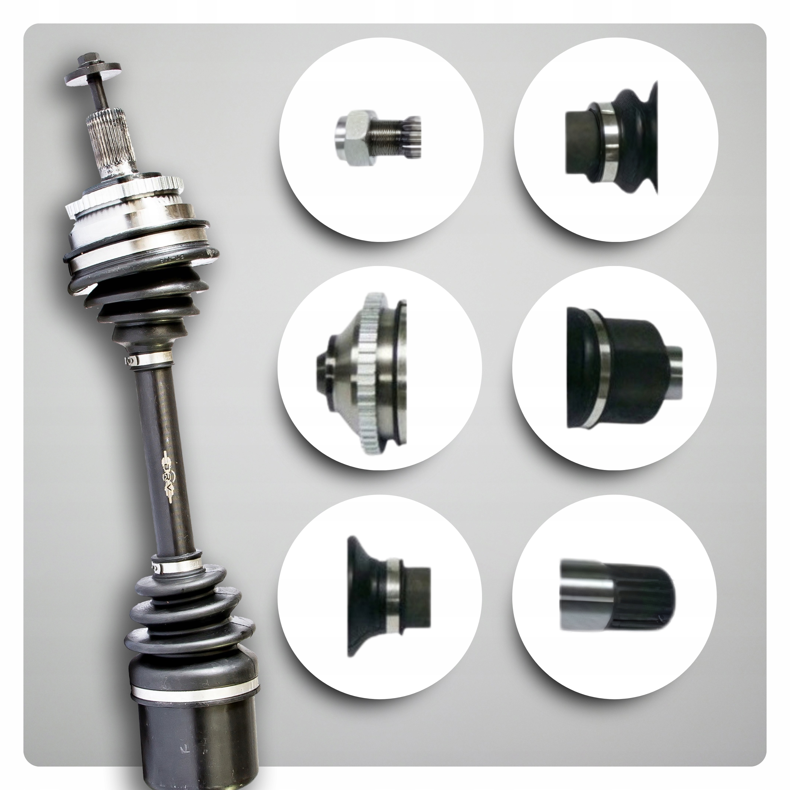 Każdy zestaw naprawczy BRV zawiera wszystkie niezbędne elementy, w tym zmontowaną półoś napędową, wałek, zewnętrzny i wewnętrzny przegub homo-kinetyczny, smar, osłony neoprenowe, opaski zaciskowe oraz nakrętkę (śrubę montażową).